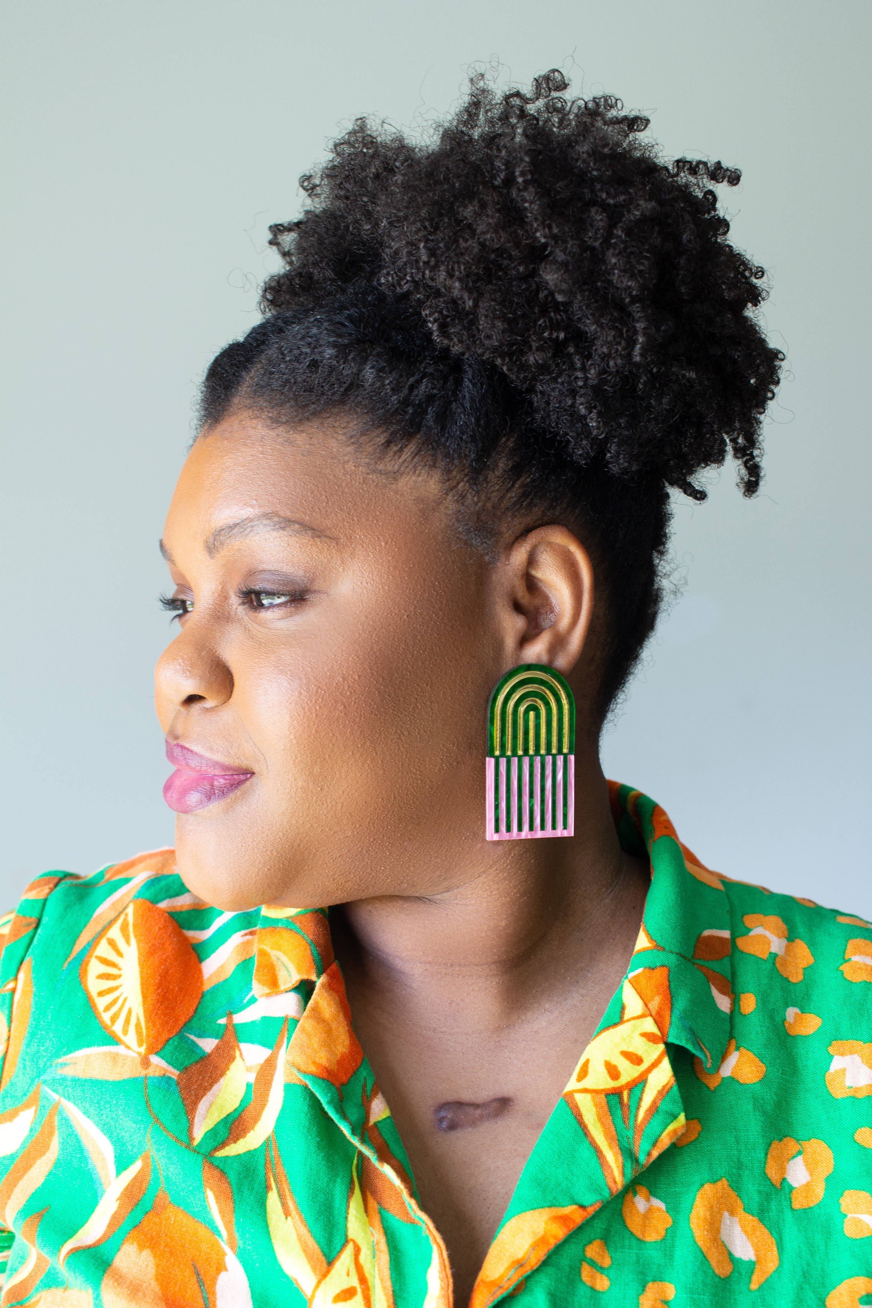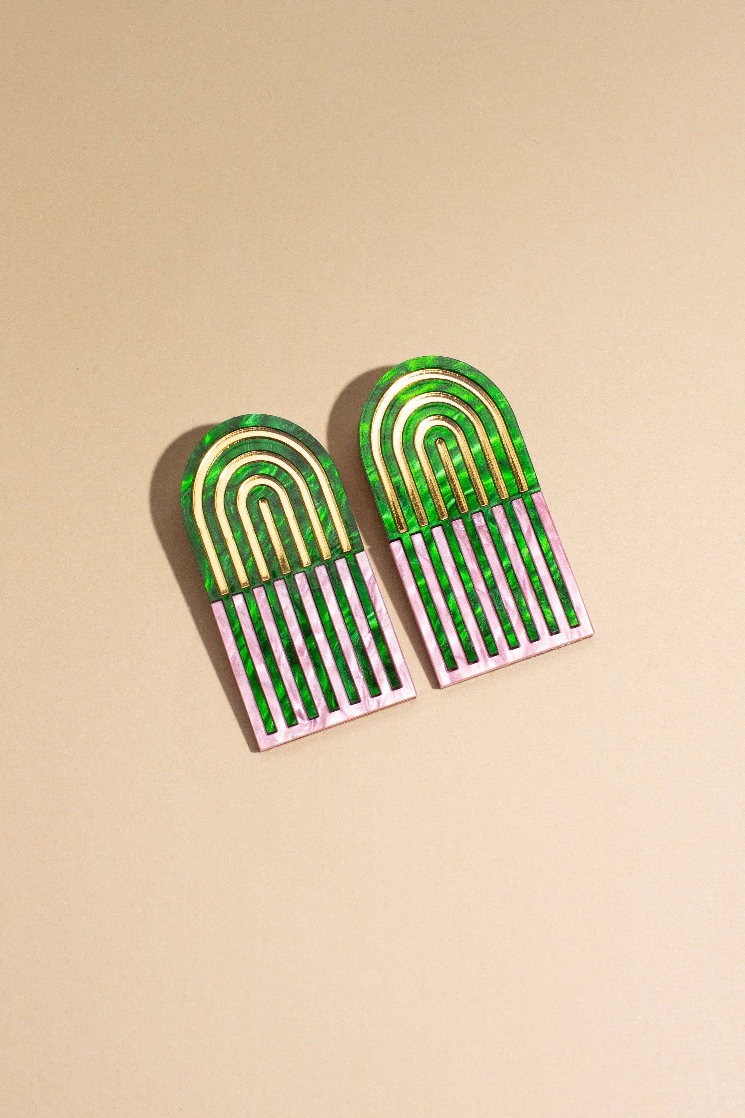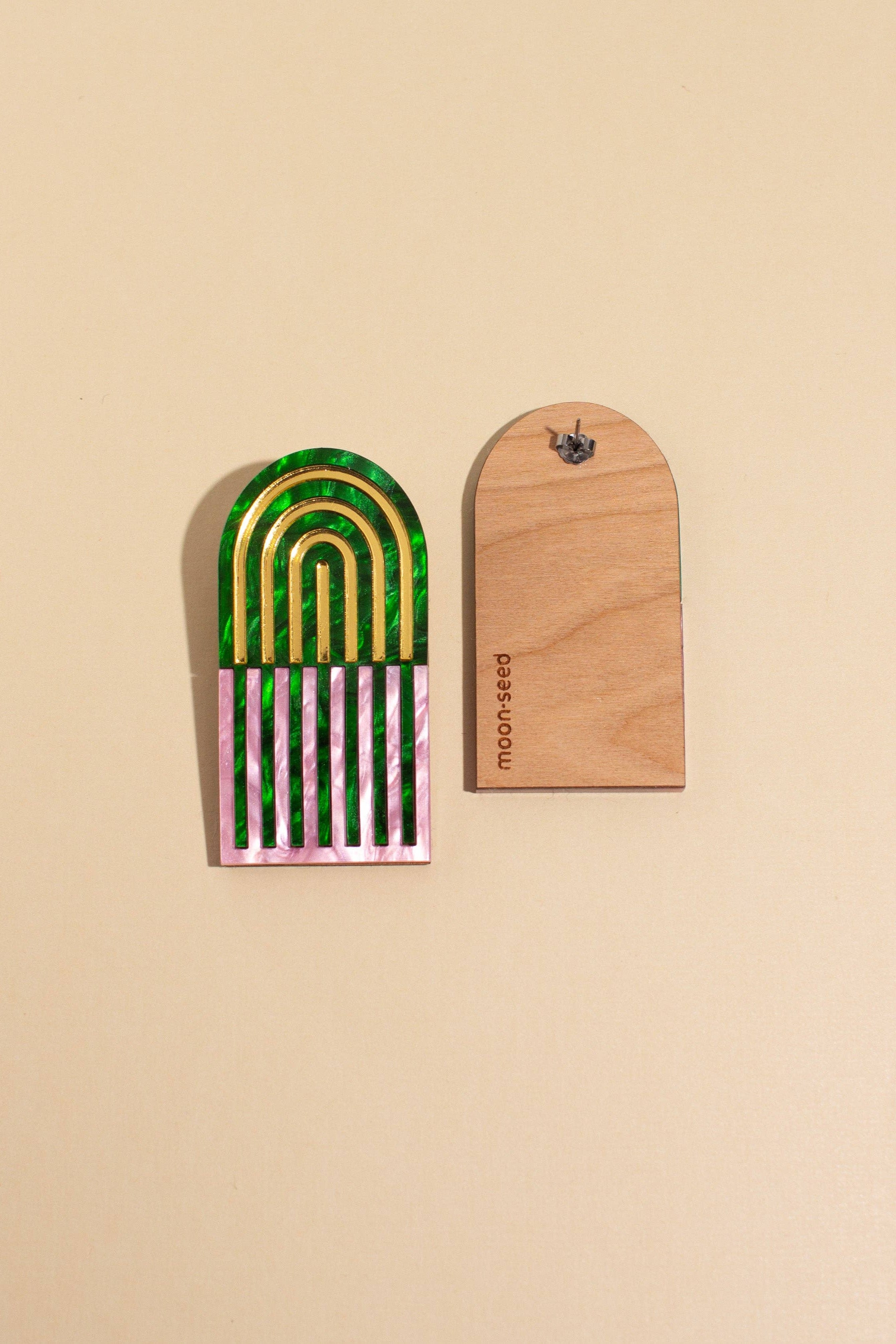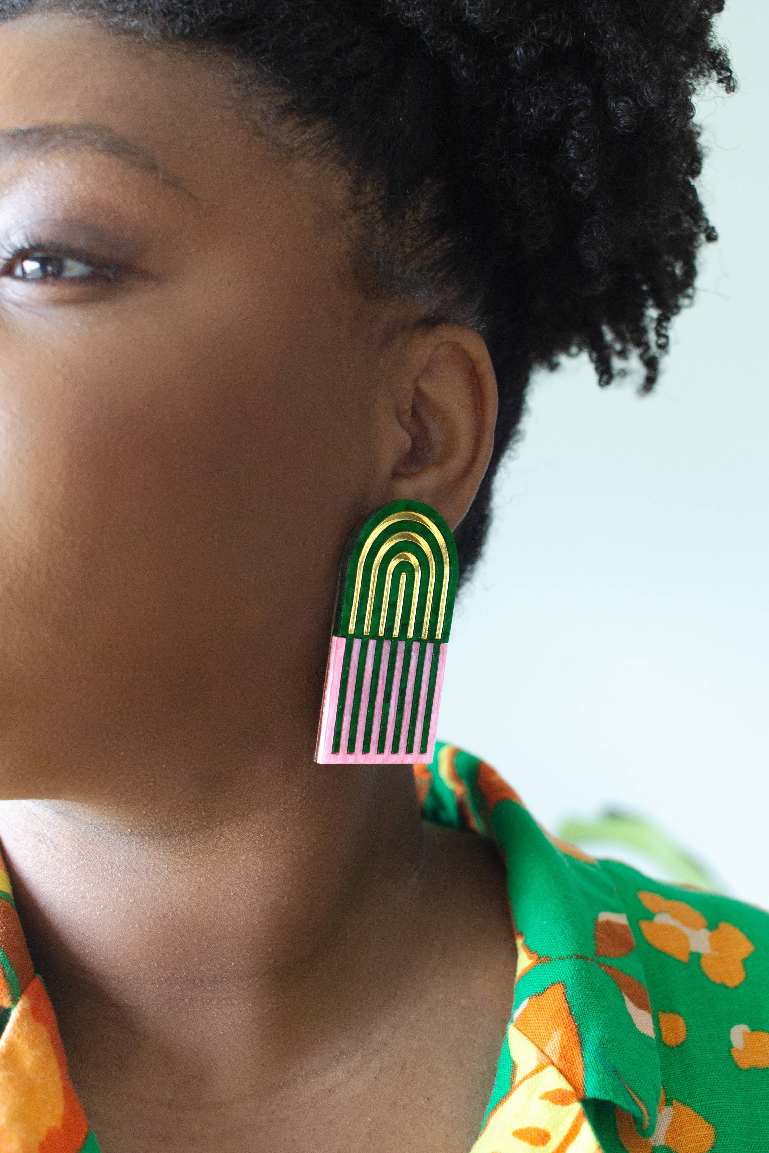 Die Anya Statement-Ohrringe von Moon-Seed aus Acryl sind die perfekte Ergänzung für jedes Outfit. Mit einer Größe von ungefähr 3,3 cm Breite x 6,6 cm Länge verleihen sie jedem Look einen Hauch von Farbe und Eleganz.