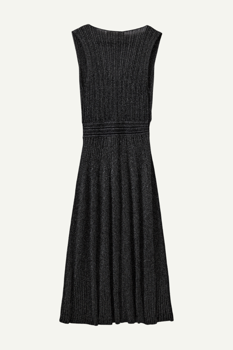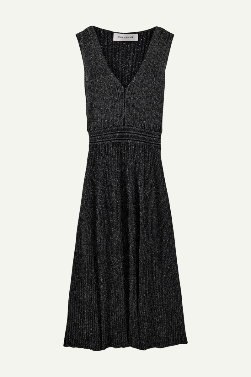 Das Kleid Celestine von SOPHIE SCHNOOR vereint Eleganz und modernen Glamour. Die taillierte Passform und der tiefe V-Ausschnitt schmeicheln die Figur, während die feine Rippstruktur an der Taille für eine raffinierte Optik sorgt. Hergestellt mit schimmerndem Lurex-Anteil, glänzt das schwarze Kleid dezent silbern – ideal für besondere Anlässe oder die Nacht. Der versteckte seitliche Reißverschluss garantiert einen perfekten Sitz und ein schlichtes Design.