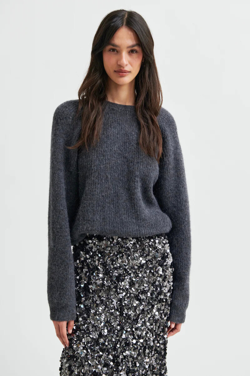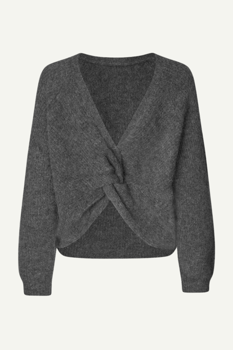 Dieser weich-fluffige Pullover von SECOND FEMALE in dunklem Grau überzeugt mit einem lockeren Schnitt und einem besonderen Knotendetail am Rücken, das sich je nach Lust auch nach vorne tragen lässt. Die überschnittenen Schultern und langen Ärmel sorgen für hohen Tragekomfort und eine moderne Optik. Perfekt für gemütliche Tage und stilvolle Looks zugleich.