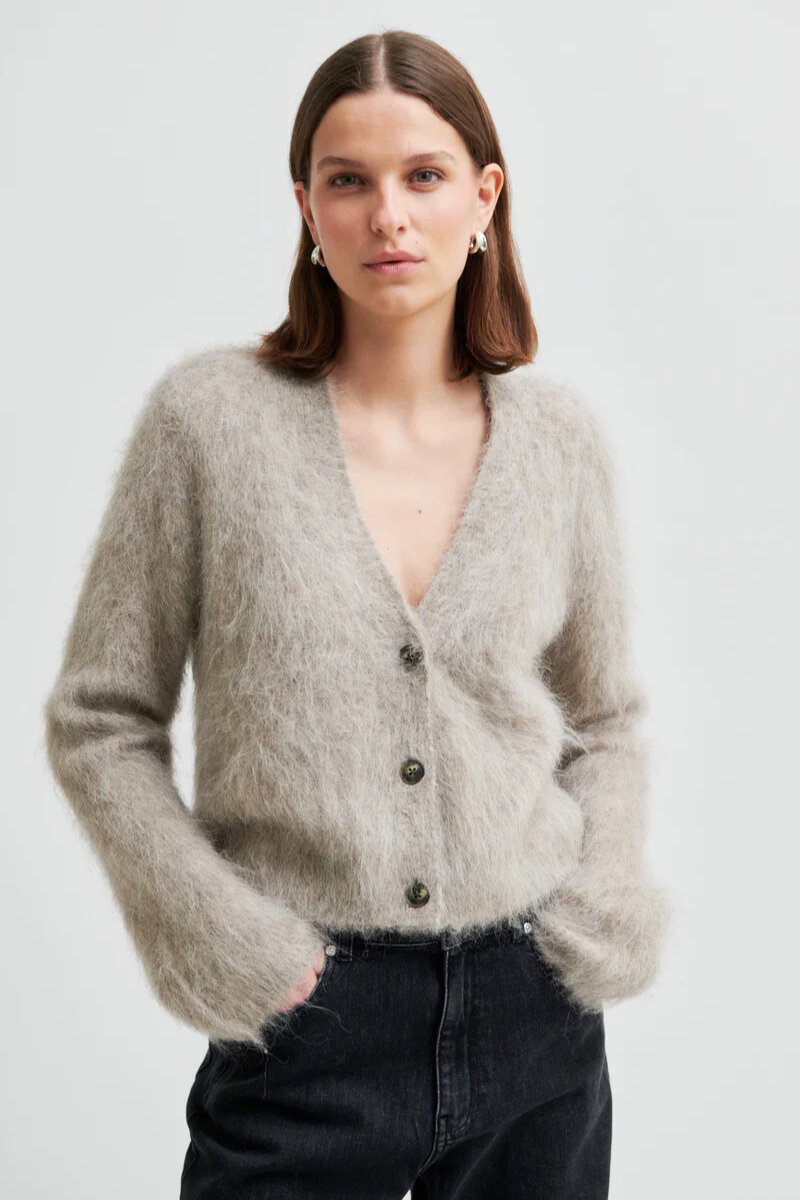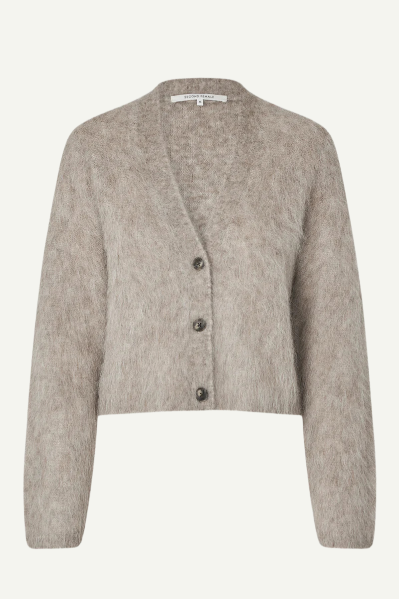 Die Strickjacke Karla von SECOND FEMALE aus einem weichen, kuscheligen Alpaka-Mix überzeugt durch ihre angenehme Wärme und einen eleganten Look. Der V-Ausschnitt und die durchgehende Knopfleiste machen sie vielseitig kombinierbar, während die langen Ärmel und die leicht kastige Passform Komfort für jeden Tag bieten. Perfekt, um deinem Outfit eine stilvolle, gemütliche Note zu verleihen.