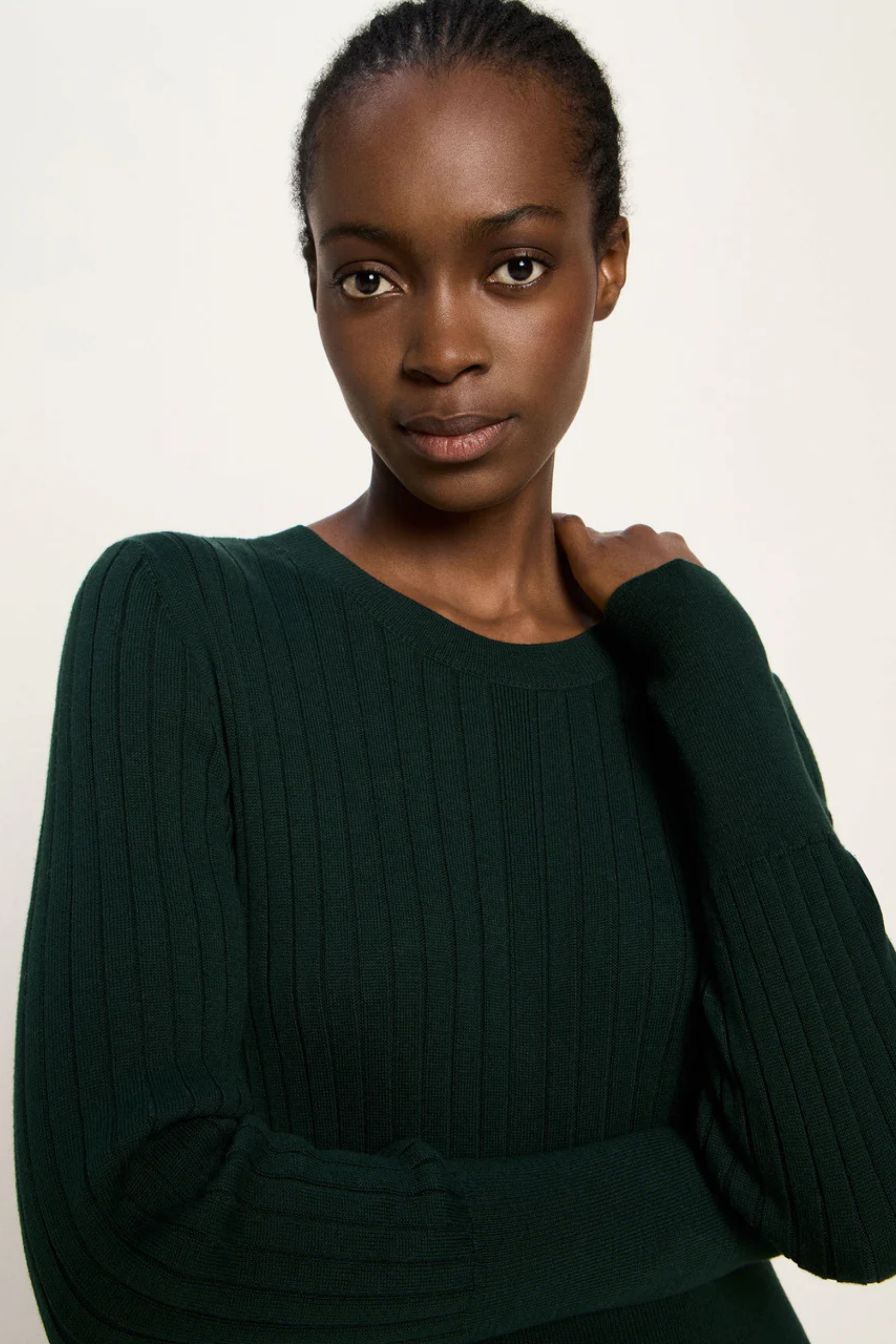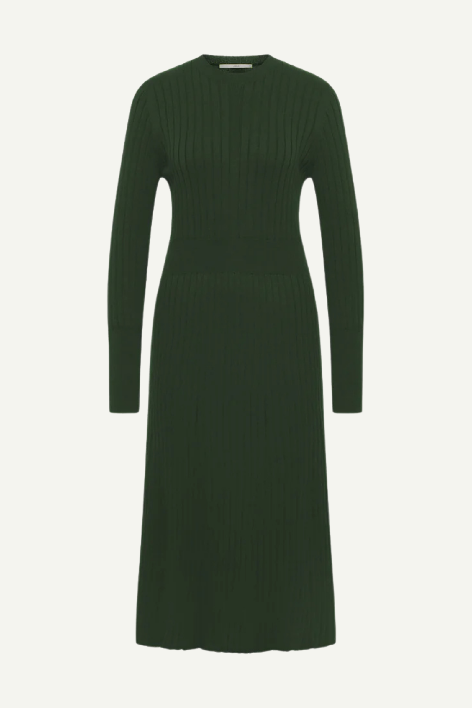Das Strickkleid Forest von LANIUS verbindet feminine Silhouette mit angenehmem Tragekomfort. Der körpernahe Oberteil und der fließende Rock schaffen eine ausgewogene, elegante Form, während das dekorative Rippenmuster dem Design eine besondere Note verleiht. Der Rundhalsausschnitt, lange Ärmel und die betonte Taille unterstreichen die harmonische Passform. Aus 100 % Bio-Baumwolle, vegan und GOTS-zertifiziert, ist es perfekt für stilvolle Looks an kühleren Tagen – solo oder kombiniert mit Stiefeln und Mantel. Ein Kleid für alle, die Nachhaltigkeit und Stil gleichermaßen schätzen.