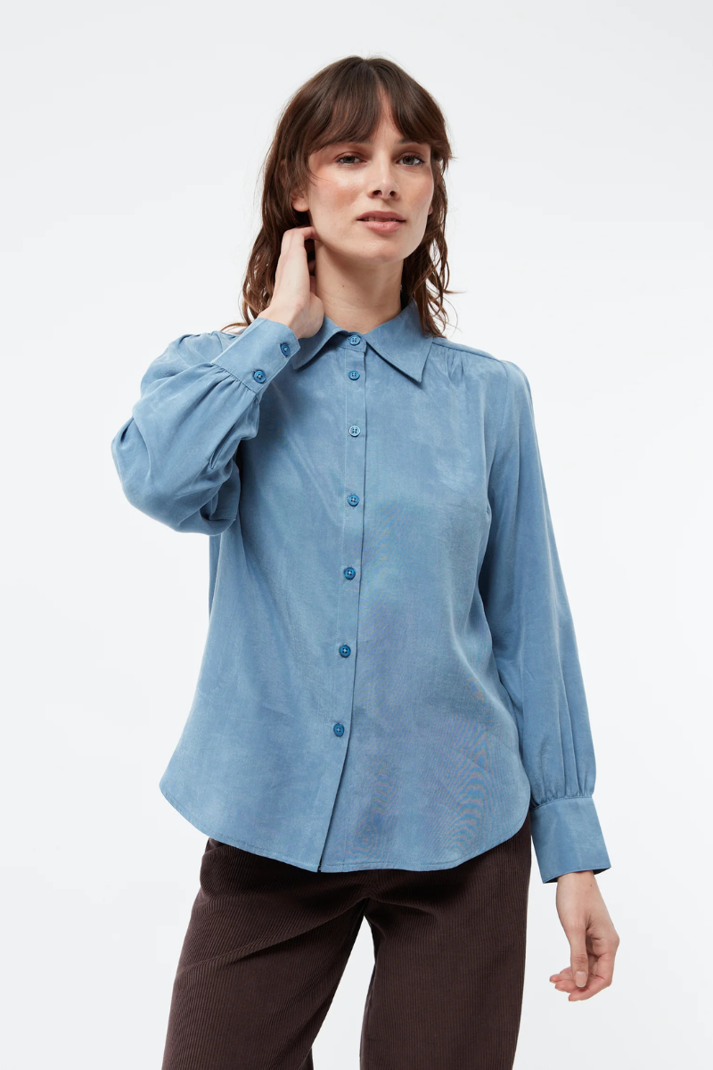 Die Bluse "Kasia Cloudy Blue" von GIVN vereint eleganten Stil mit angenehmem Tragekomfort dank hochwertigem TENCEL™ Lyocell. Das feuchtigkeitsregulierende und wärmeausgleichende Material sorgt für ein angenehmes Hautgefühl, während der dezente Peach-Effekt der Bluse eine edle Note verleiht. Ihr weiter Schnitt mit Umlegekragen, langen Ärmeln und raffinierten Details wie der Rückenpasse mit Raffungen macht sie vielseitig kombinierbar – perfekt für festliche Anlässe oder lässige Looks mit Jeans und Sneakern. Ein Must-have, das Stil und Komfort mühelos verbindet. Fair hergestellt in Izmir, Turkey.