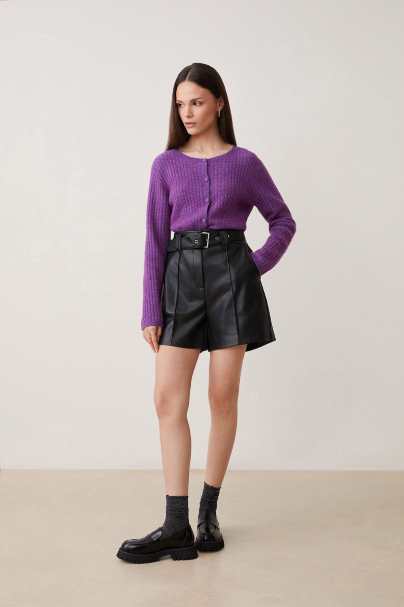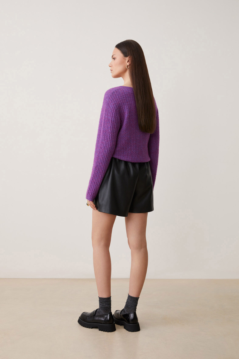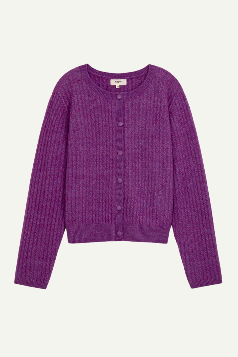 Die Strickjacke Gemini Violet von SUNCOO ist ein eleganter, lila Cardigan mit langen Ärmeln und einer Ton-in-Ton geknöpften Verschluss. Hergestellt aus RWS Wolle, bietet sie nicht nur ein schickes Design, sondern auch eine qualitativ hochwertige Materialwahl.