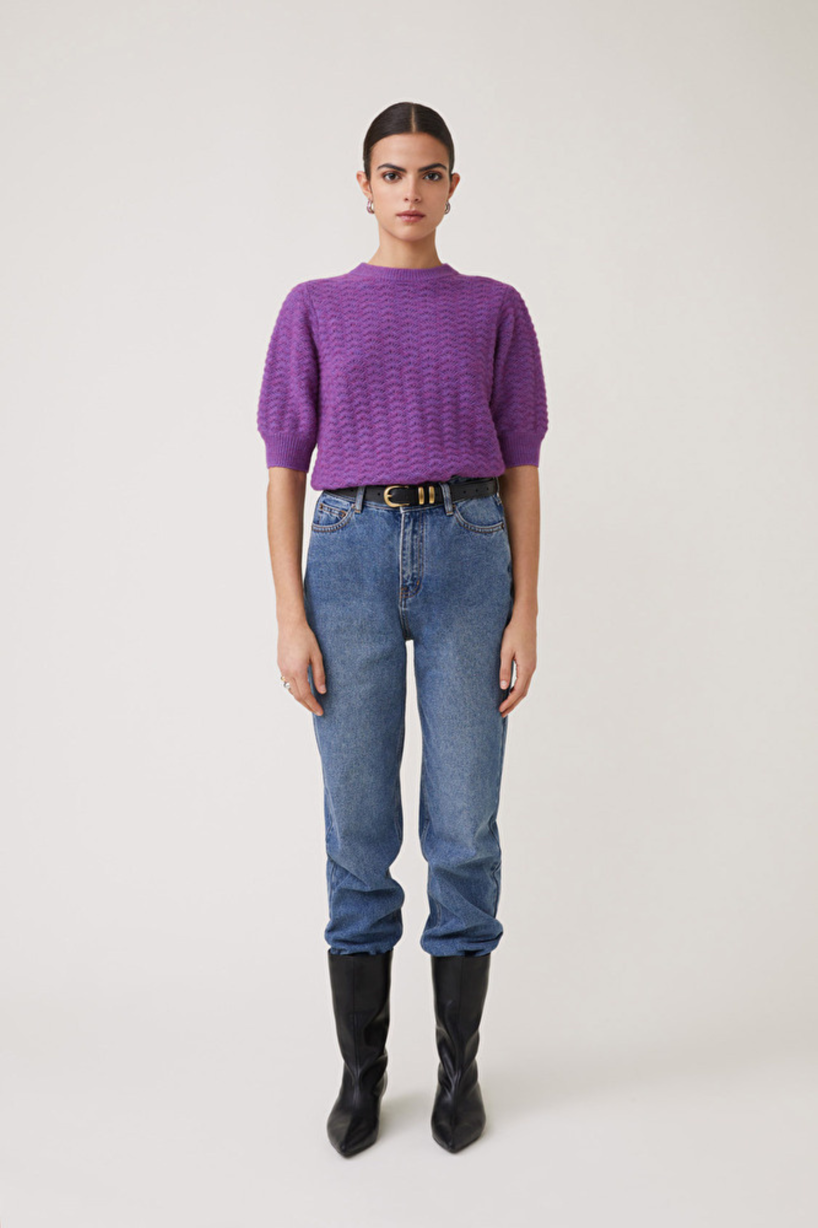Ein purpurfarbener, edler Pullover von Suncoo mit langen Ärmeln und gerippten Bündchen und Saum. Hergestellt aus hochwertiger, nachhaltiger RWS-Wolle welche dich beim Tragen warm hält. Perfekt für jeden Anlass und jede Jahreszeit.