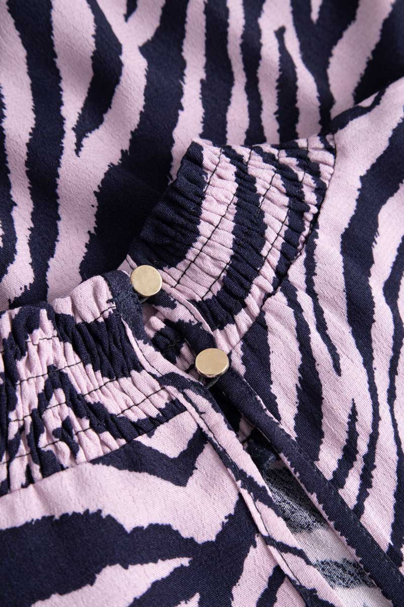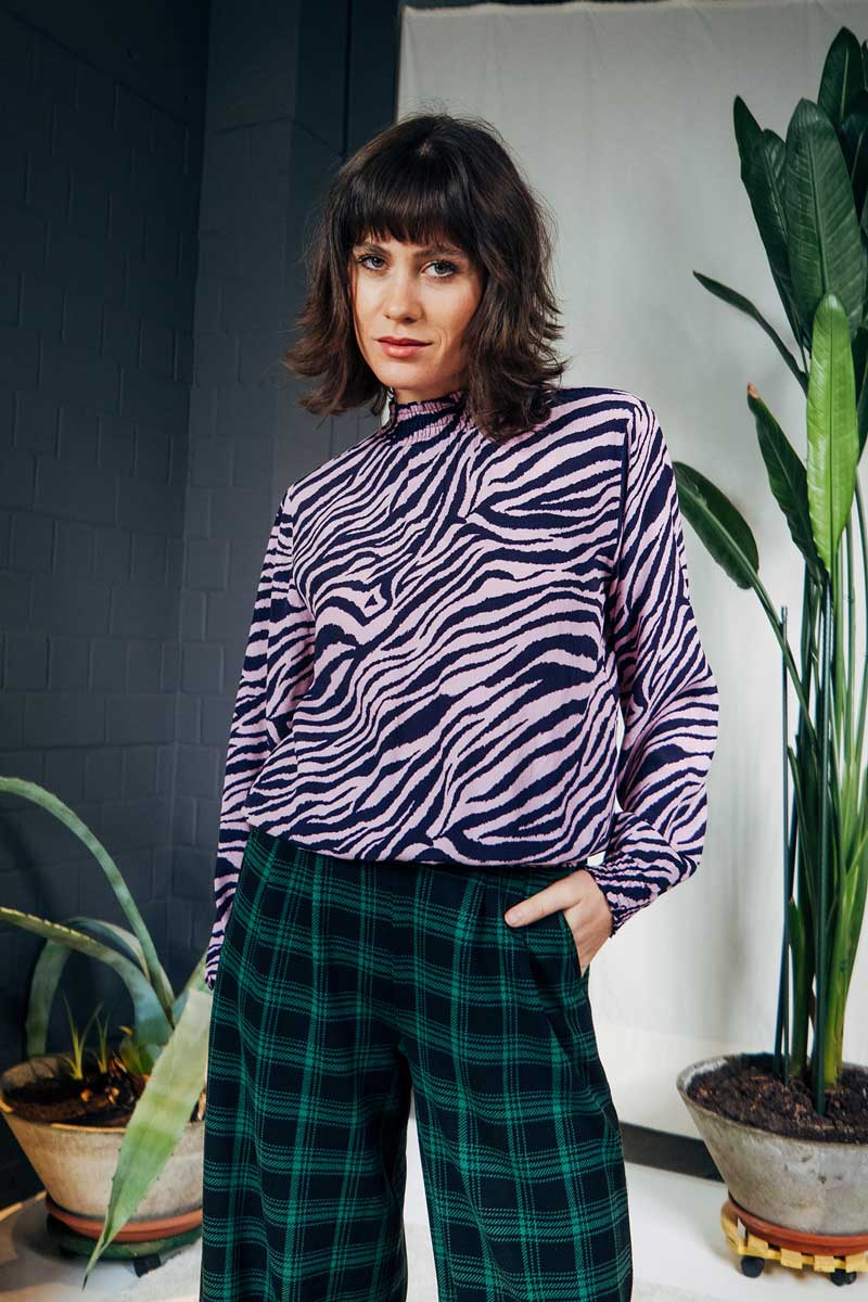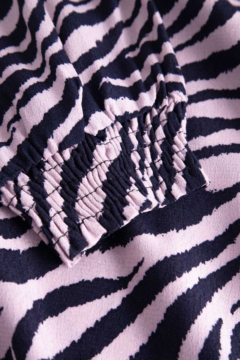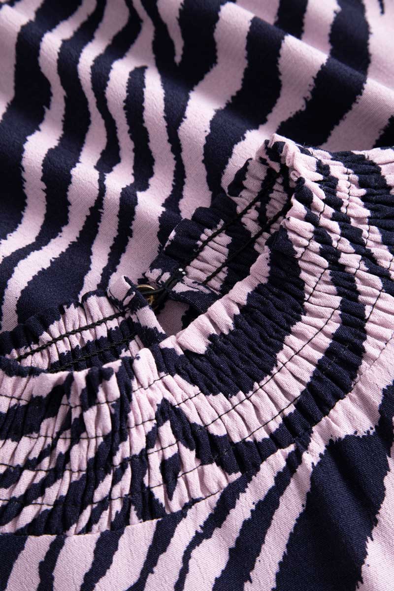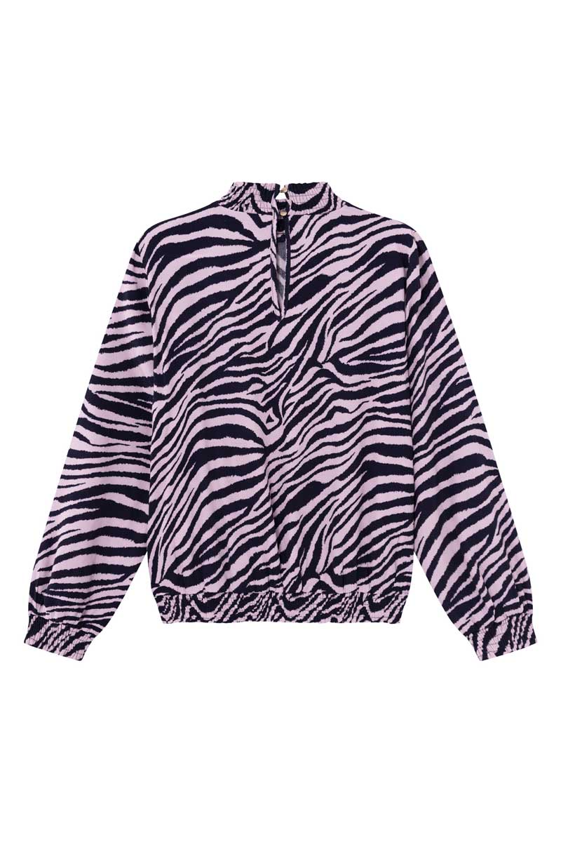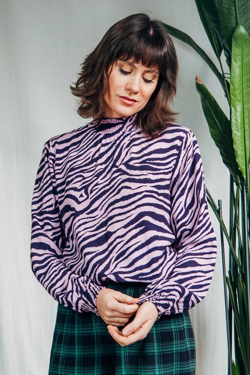 Die Bluse in der Farbe/Muster Zebra Purple ist aus einem leichten Crepe-Webstoff gefertigt und bietet keinen Stretch. Die lockere Silhouette sorgt für ein angenehmes Tragegefühl. Der Stehkragen ist mit einem breiten Gummismokeinsatz versehen und verleiht der Bluse eine besondere Note. Im Rückteil befindet sich ein Schlitz mit Knöpfen. Die langen Ärmel sind mit Gummismok-Bündchen versehen und der Saum ebenfalls. Animal Print ist immer im Trend und auf dieser Bluse in buntem Zebra-Design mit Smok-Details wirkt er besonders chic. Die Bluse ist lässig und dennoch elegant und eignet sich für viele Anlässe.