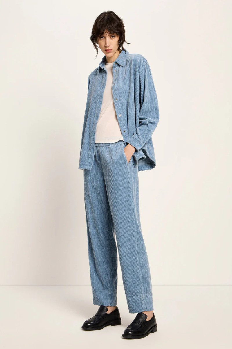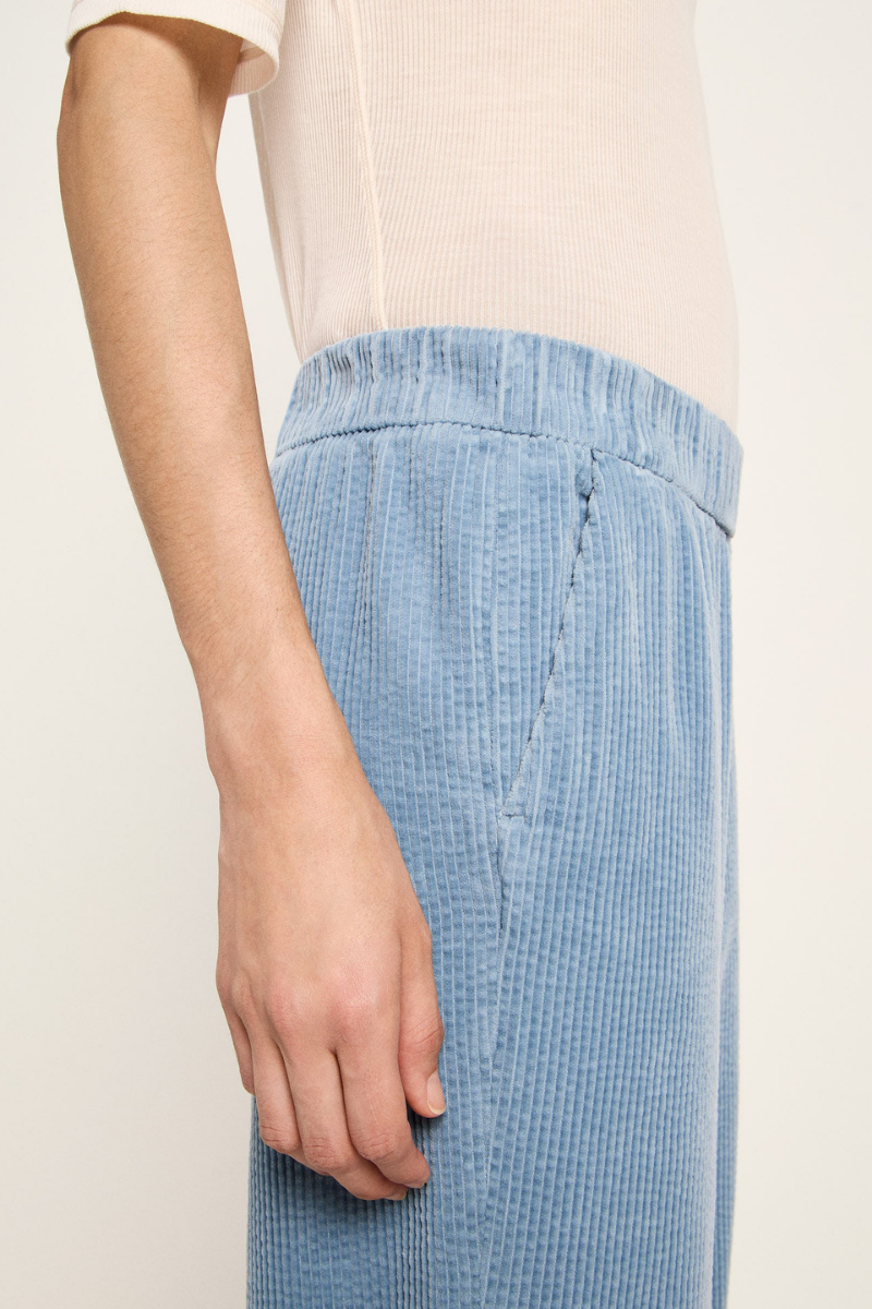 Die Hose Kord Light Vintage Blue von LANIUS aus GOTS-zertifizierter Bio-Baumwolle verbindet nachhaltigen Komfort mit zeitlosem Stil. Ihr elastischer Bund mit Tunnelzug sorgt für flexible Passform und einfachen Sitz – perfekt für den Alltag. Die feine Rippenstruktur des klassischen Kordstoffs verleiht der Hose Charakter und verleiht jedem Outfit eine entspannte, aber stilbewusste Note. Ein vielseitiges Must-have für moderne Looks mit legerem Chic.