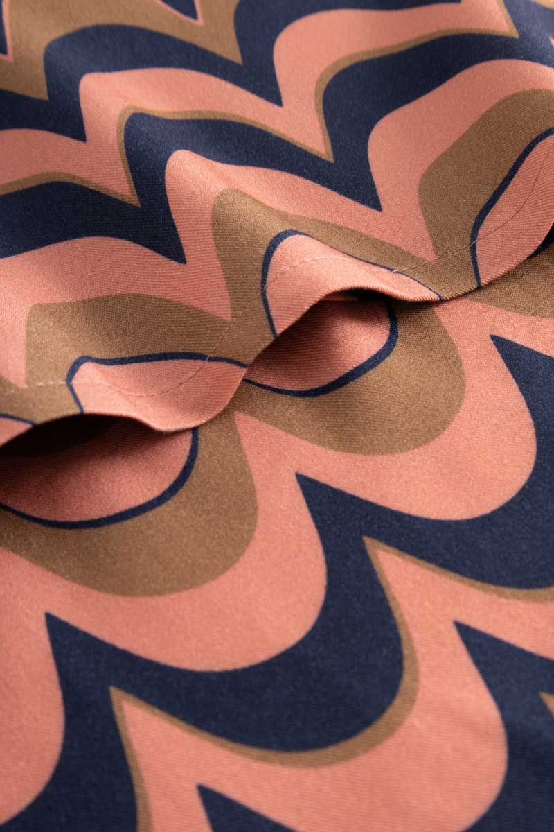 Die Schluppenbluse in der Farbe/Muster "Wavy" ist aus nachhaltiger Viskose gefertigt und besticht durch ihren weichen Webstoff mit Twillbindung. Die Bluse verfügt über keine Stretch-Eigenschaften und präsentiert sich in einer geraden Silhouette. Der V-Ausschnitt mit Schluppe sowie die langen Ärmel mit Gummibund runden das Design ab. Die Schluppenbluse ist ein Retro Klassiker und besonders cool in unserem 70s wavy-Print. Ein Must-Have für jede modebewusste Frau.