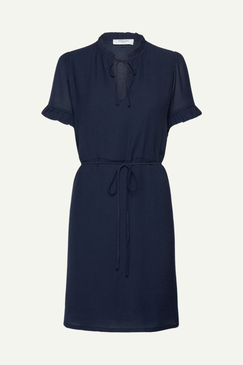 Das Kleid Roa Navy ist das perfekte Sommerkleid für elegante und unbeschwerte Tage. Mit seinem leichten und luftigen Stil schmeichelt es der Figur und ist durch die Rüschen-Details an Hals und Ärmeln ein echter Hingucker. Durch den Stoffgürtel und die verstellbaren Bändchen am Halsausschnitt lässt es sich individuell anpassen.