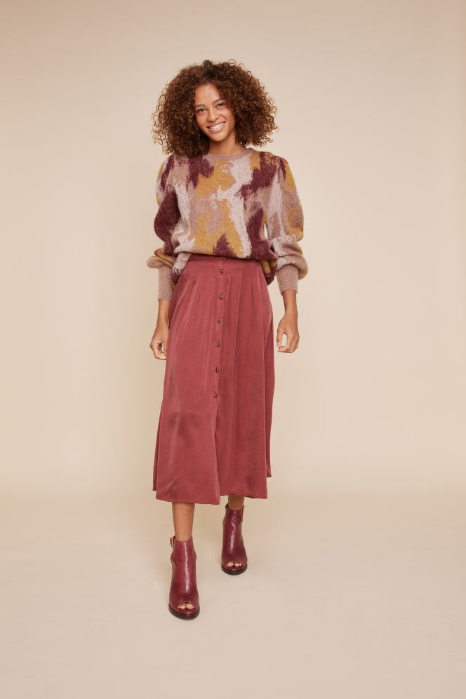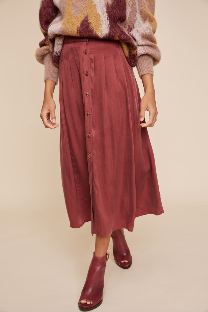 Hoch taillierter Midirock mit Falten, der vorne in der Mitte mit ausgefallenen Knöpfen komplett durchgeknöpft ist.