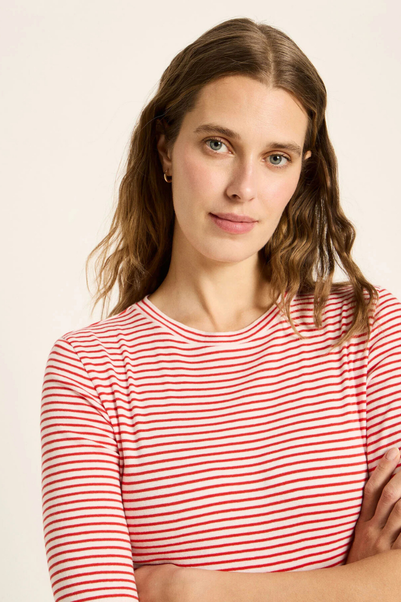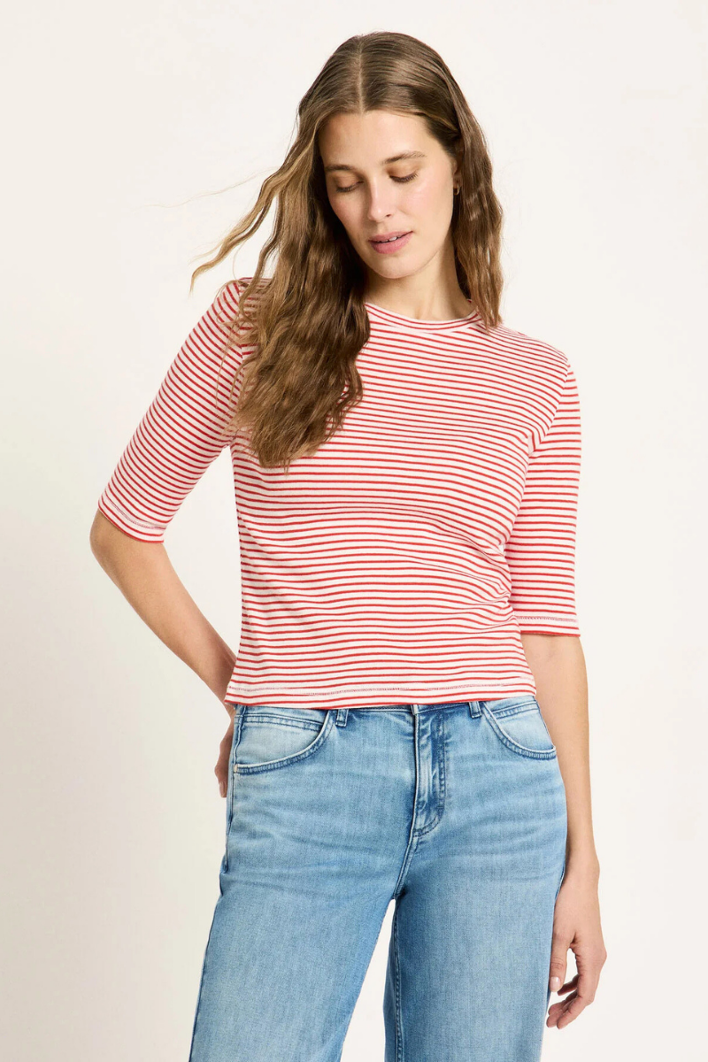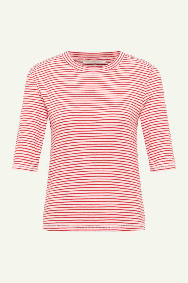 Dieses Halbarmshirt von LANIUS vereint Nachhaltigkeit mit zeitlosem Design. Aus GOTS-zertifizierter Bio-Baumwolle gefertigt, besticht es durch ein feines Streifenmuster in Lava Red und Creme, das sowohl beruhigend als auch modern wirkt. Die halblangen Ärmel schaffen eine entspannte Silhouette, während die atmungsaktive Qualität optimalen Tragekomfort an warmen Tagen bietet. Das Shirt eignet sich hervorragend als vielseitiges Layering-Piece in der Übergangszeit und lässt sich mühelos zu Jeans, Stoffhose oder Rock kombinieren – ein zuverlässiger Klassiker für jeden Kleiderschrank.