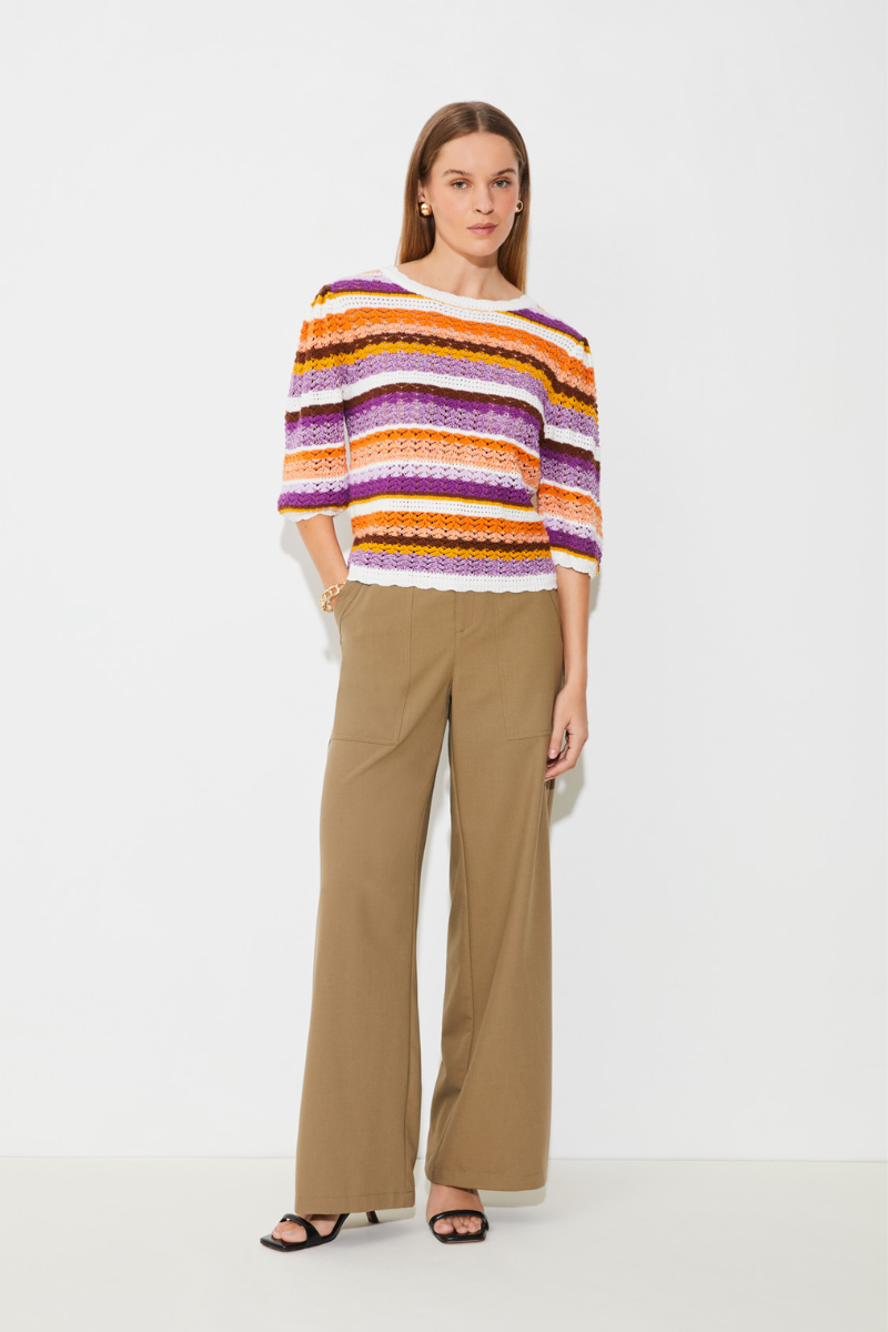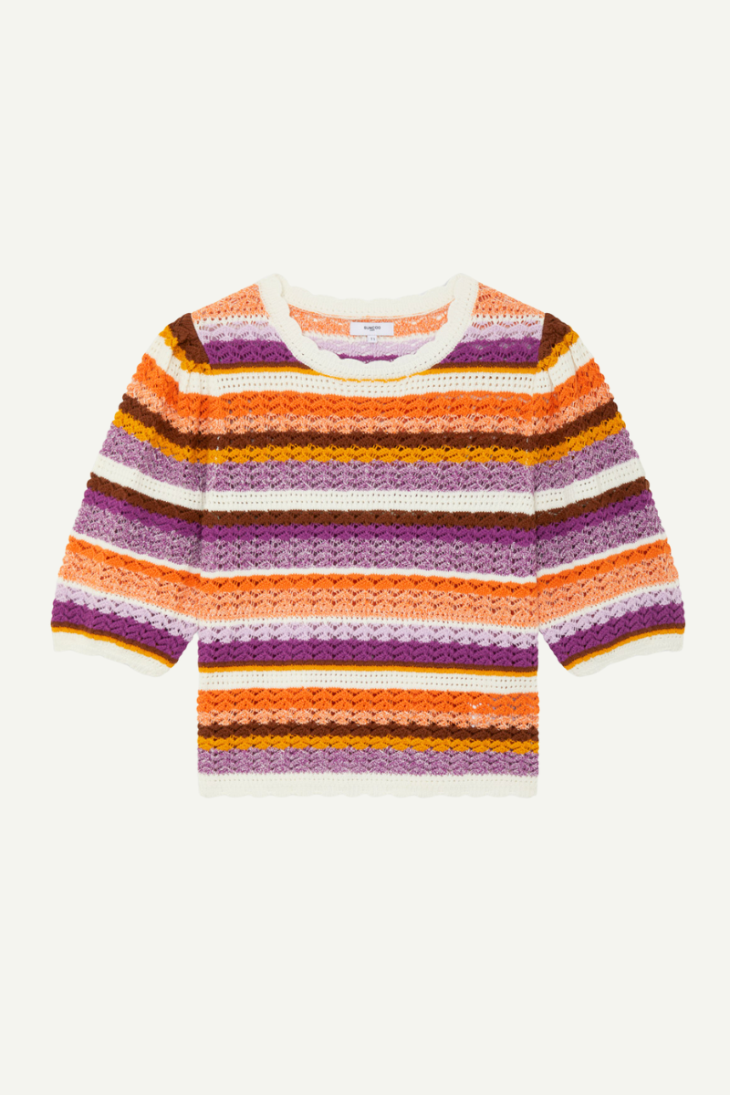 Dieser gestreifte Strickpullover von SUNCOO Paris ist der perfekte Begleiter für den Sommer. Dank des Rundkragens und der Puffärmel ist er bequem und dennoch stilvoll. Die verspielten Abschlüsse an Kragen, Ärmel und Saum verleihen ihm eine besondere Note. Durch das Multicolor-Design passt er zu vielen Outfits und ist ein echter Hingucker.