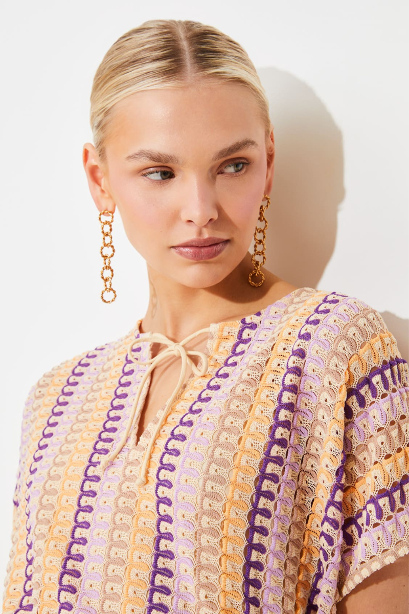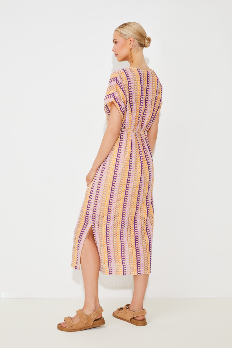 Das Strickkleid Calvin von SUNCOO Paris ist perfekt für einen leichten Sommer-Look. Das wunderschöne Häkeldesign verleiht dem Kleid einen Hauch von Raffinesse. Der V-Ausschnitt mit Kordelzug betont gekonnt das Dekolleté und die kurzen Ärmel sorgen für eine sommerliche Leichtigkeit. Dank des abnehmbaren Kordelzugs kann das Kleid individuell an die Taille angepasst werden. Der seitliche Schlitz bringt zusätzliche Bewegungsfreiheit. Ein absolutes Must-Have.
