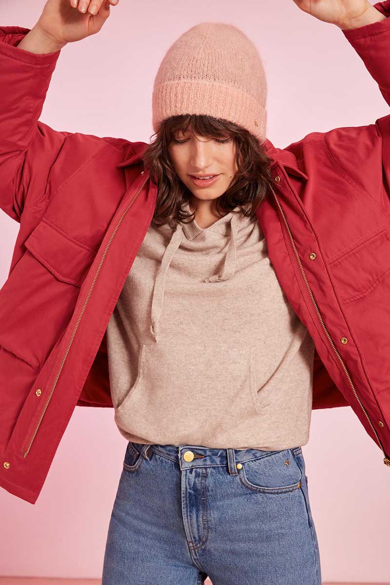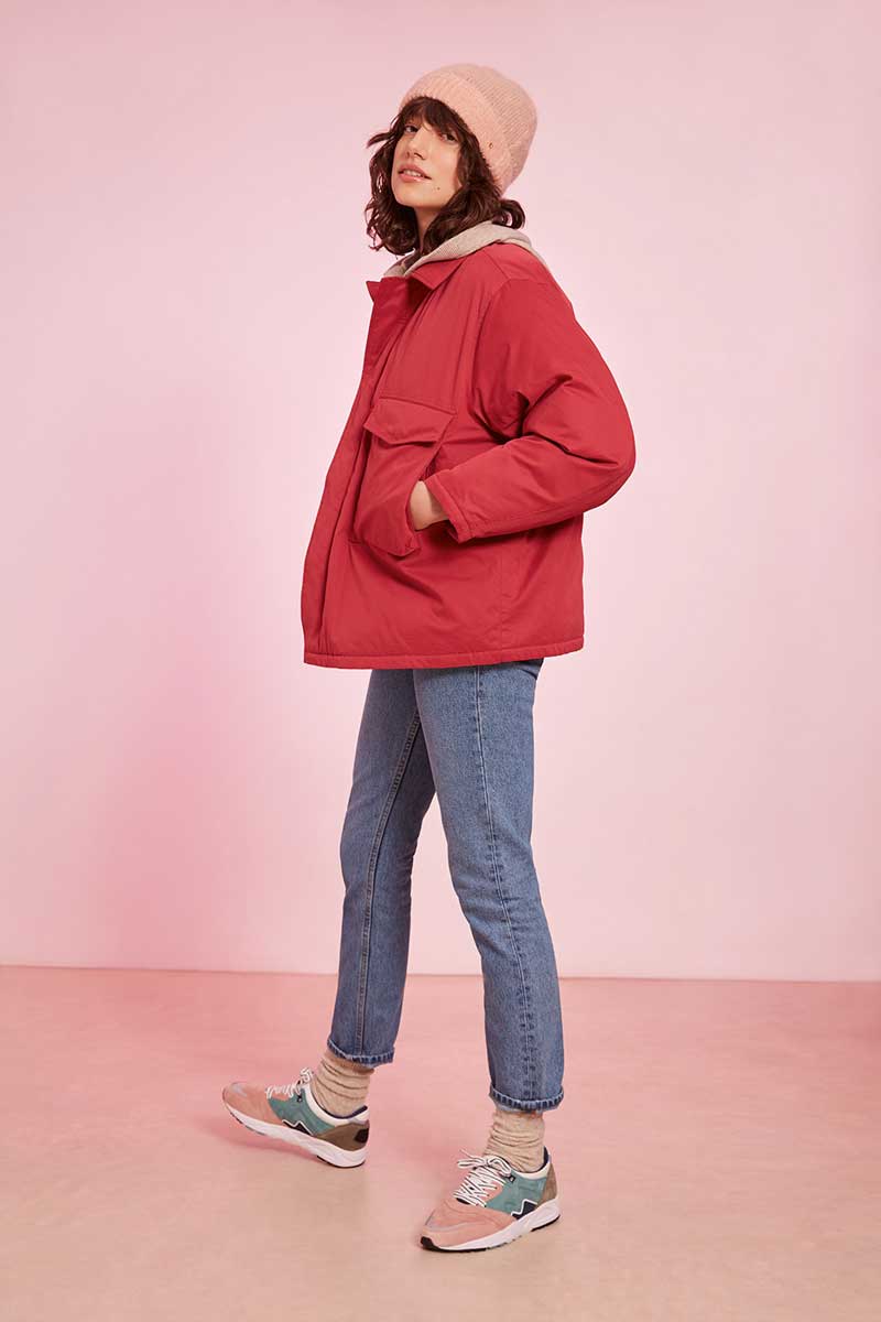 Voluminöse Regenjacke aus Baumwoll-Nylon-Mix, kurz, mit zwei Fronttaschen/Eingriffstaschen, Kragen, Reissverschluss und Knöpfen.