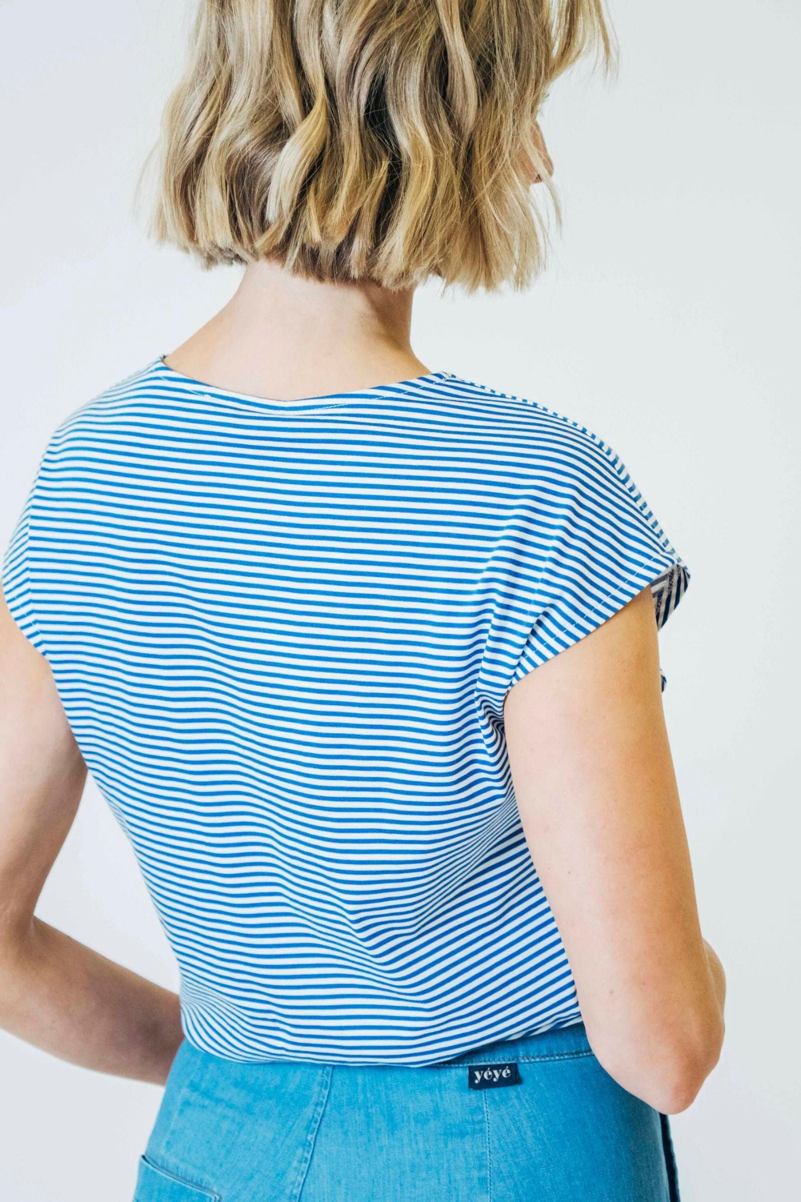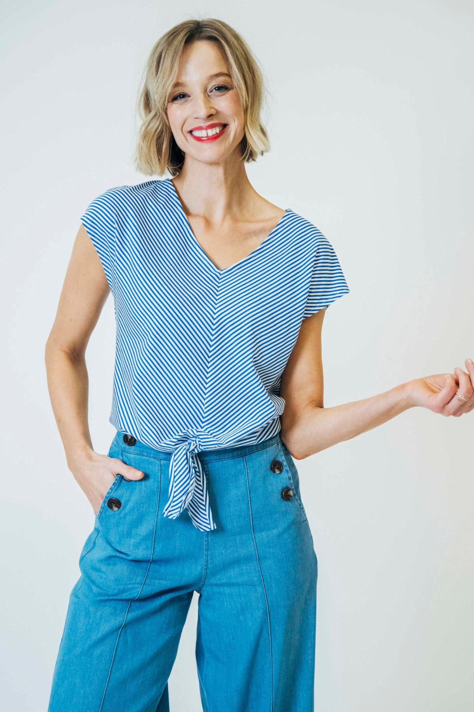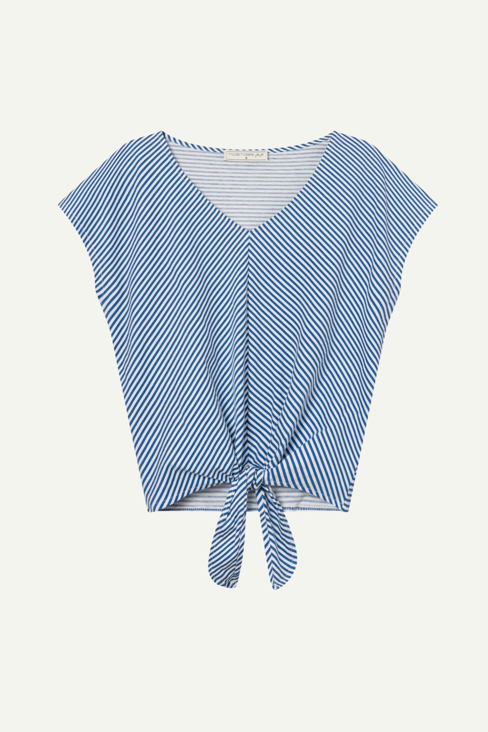 Verleihe deinem Look mit diesem ärmellosen Knotenshirt von Mademoiselle YéYé einen Hauch von maritimem Flair. Das lässige Essential besticht nicht nur optisch, sondern ist auch angenehm zu tragen. Mit überschnittenen Schultern und einem V-Ausschnitt mit Knotendetail ist es ein echter Hingucker.