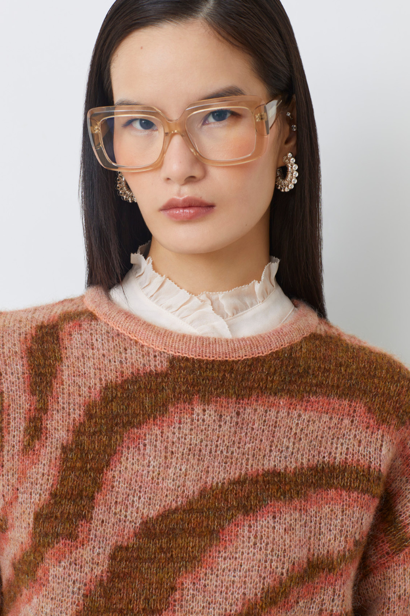 Der Pullover "Page Blush" von SUNCOO vereint Wärme und Stil in einem kuscheligen Strickdesign mit trendigem Zebramuster. Der lockere Schnitt und der gemütliche Rundhalsausschnitt sorgen für angenehmen Tragekomfort, ideal für entspannte Tage oder schicke Freizeitlooks.