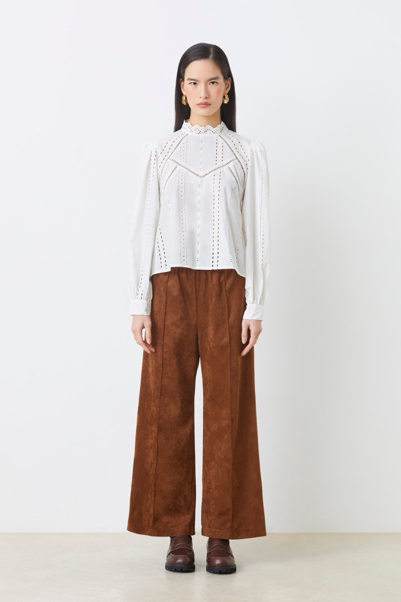 Die Hose "Johan Choco" von SUNCOO überzeugt mit ihrem modernen Wide-Leg Schnitt und sorgt für einen entspannten, zugleich eleganten Look. Die tonalen Reliefpaspeln an der Vorderseite setzen dezente Akzente, während der elastische Bund für angenehmen Tragekomfort sorgt.