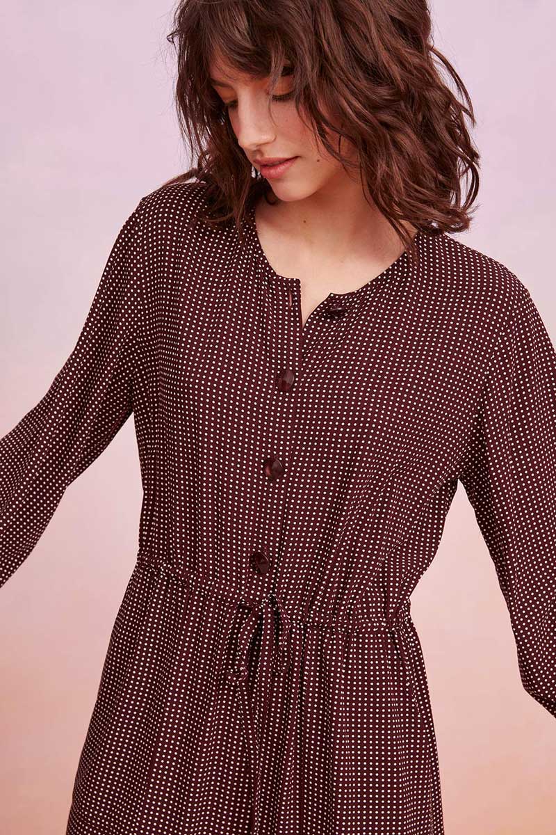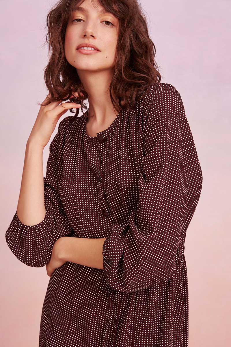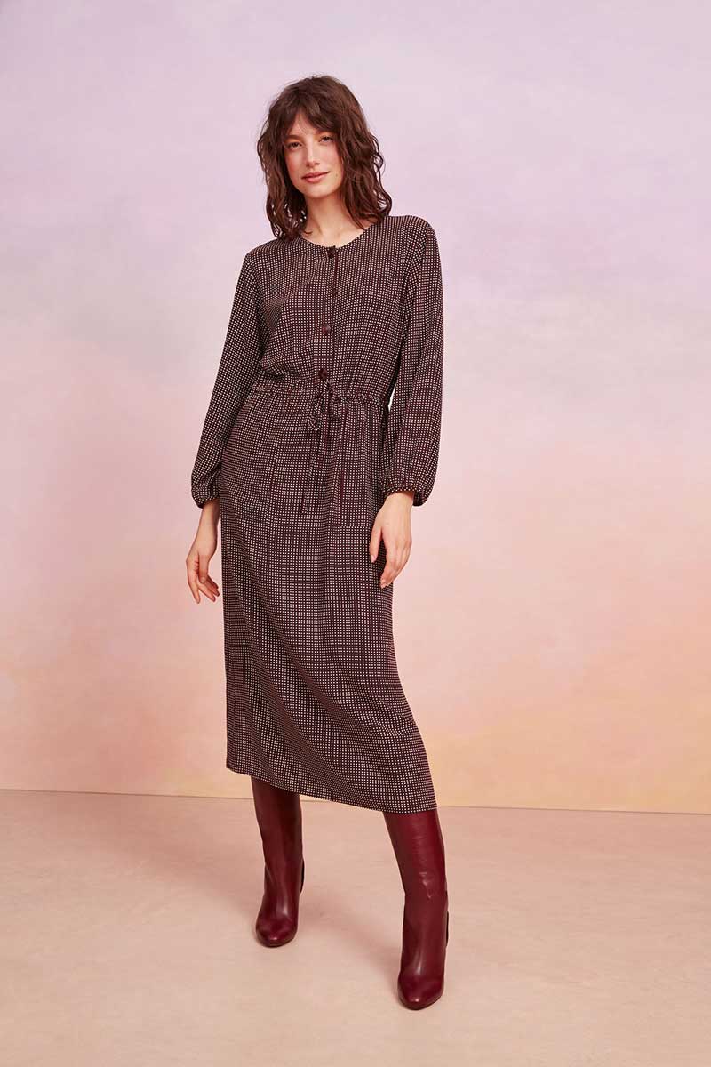Langes Maxi-Kleid mit Polka-Dot-Druck aus weicher Viskose mit langen gerafften Ärmeln, Rundhalsausschnitt, Knopfleiste vorne, Aufgesetzten Cargo-Taschen vorne und dünnem Stoffeigenem Bindegürtel.