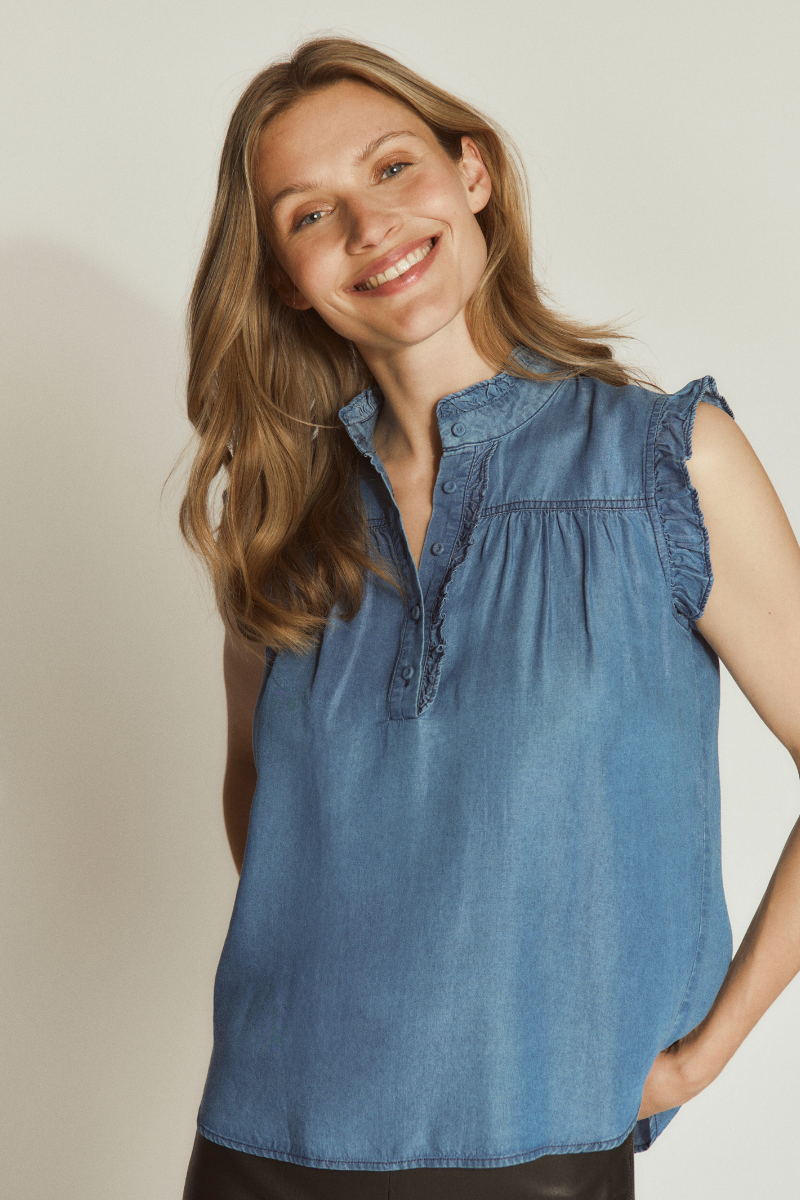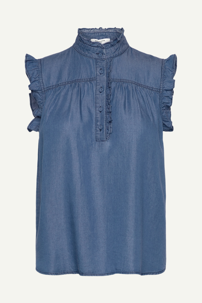 Das RWDallas Top von Rosemunde Copenhagen besticht durch seinen halbhohen Kragen und raffinierte Rüschendetails an Kragen, Ärmelausschnitt und Knopfleiste. Dieses elegante Oberteil verbindet Feminität mit modernem Design und lässt sich mühelos zu einem zeitgemäßen, anspruchsvollen Look kombinieren. Ein trendiges Must-have für die aktuelle Saison.