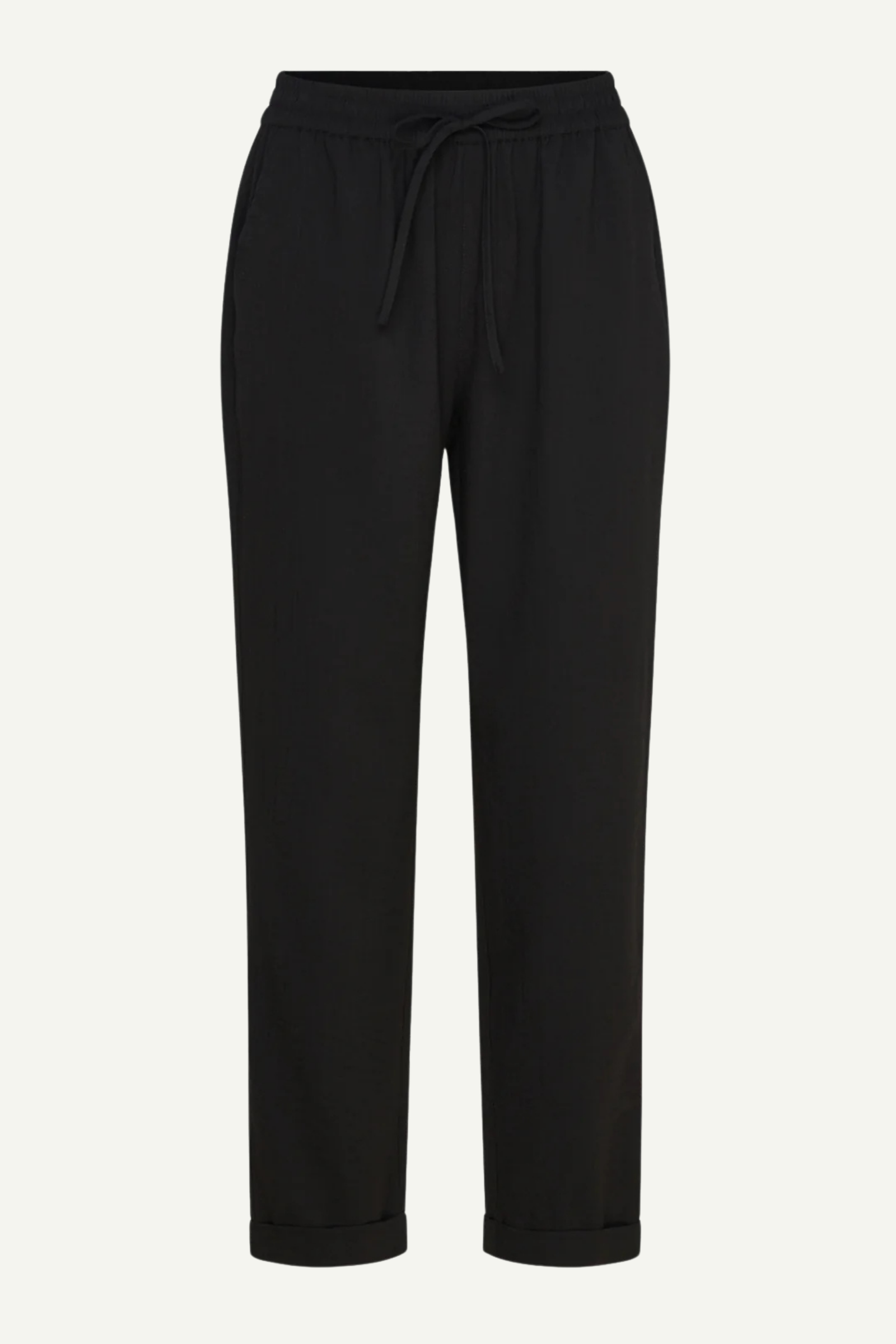 Die RMWTalia Hose von Rosemunde Copenhagen besticht durch ihre vielseitige Passform mit mittlerer Leibhöhe und verstellbarem Kordelzug. Der elastische Bund garantiert ganztägigen Tragekomfort, während das konisch zulaufende Bein mit weichen Falten eine lockere Silhouette an den Oberschenkeln schafft. Tragen Sie sie hoch oder tief – diese Hose passt sich Ihrem Stil an. Mit praktischen Fronttaschen und umgeschlagenem Saum lässt sie sich mühelos kombinieren.