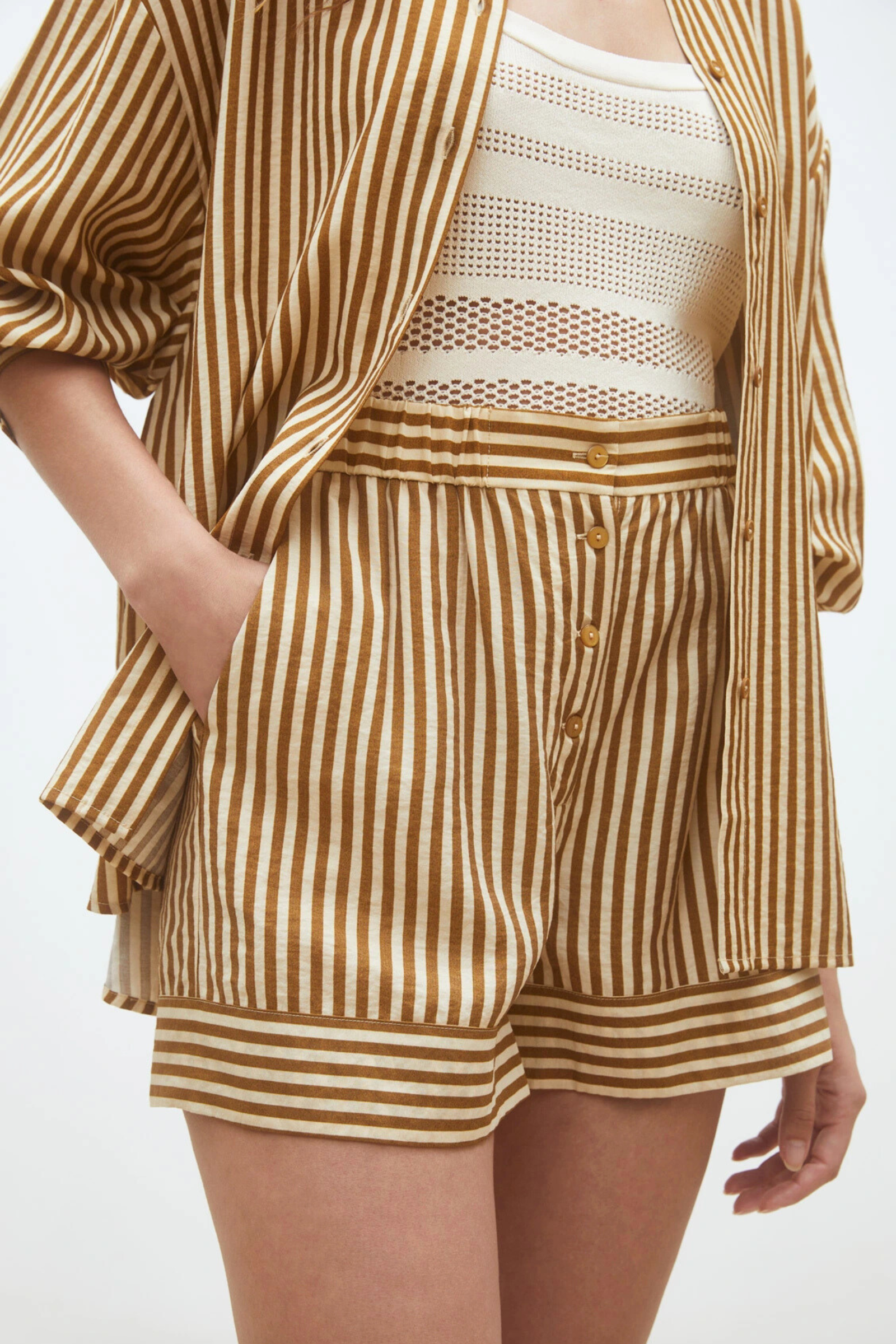 Fliessend-leichte Shorts von SUNCOO mit hohem Bund und klassischem Streifenmuster. Die Front-Knopfleiste sorgt für einfaches An- und Ausziehen, während das elastische Taillenband optimalen Komfort bietet. Zwei seitliche Taschen bieten praktischen Stauraum. Perfekt für entspannte Sommertage.