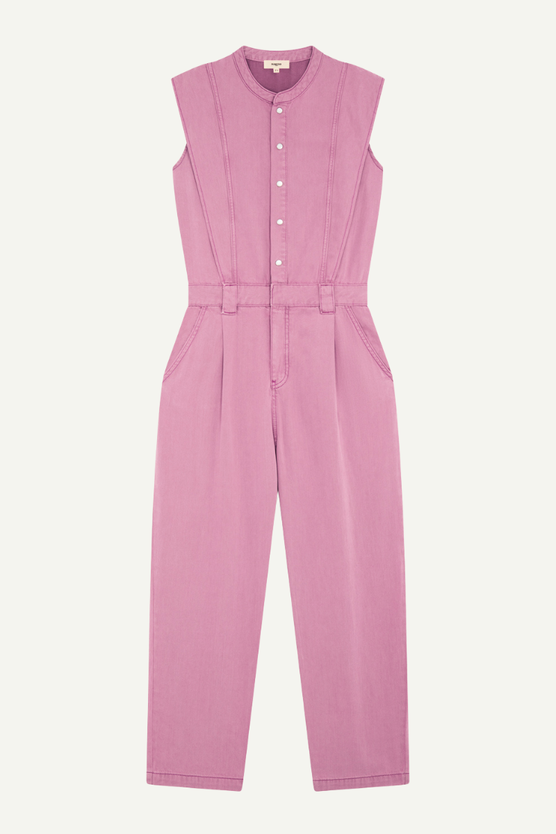 Eleganter, ärmelloser Jumpsuit aus leichtem Jeansstoff von SUNCOO Paris. Das Modell besticht durch praktische Eingrifftaschen vorne und hinten, eine klassische Knopfleiste und Gürtelschlaufen für einen perfekt taillierten Sitz. Die hochwertige Materialzusammensetzung aus 70% Lyocell FSC und 30% Baumwolle sorgt für Komfort und Atmungsaktivität. Ein vielseitiges Piece für jeden Anlass – vom Büro bis zum Wochenende.