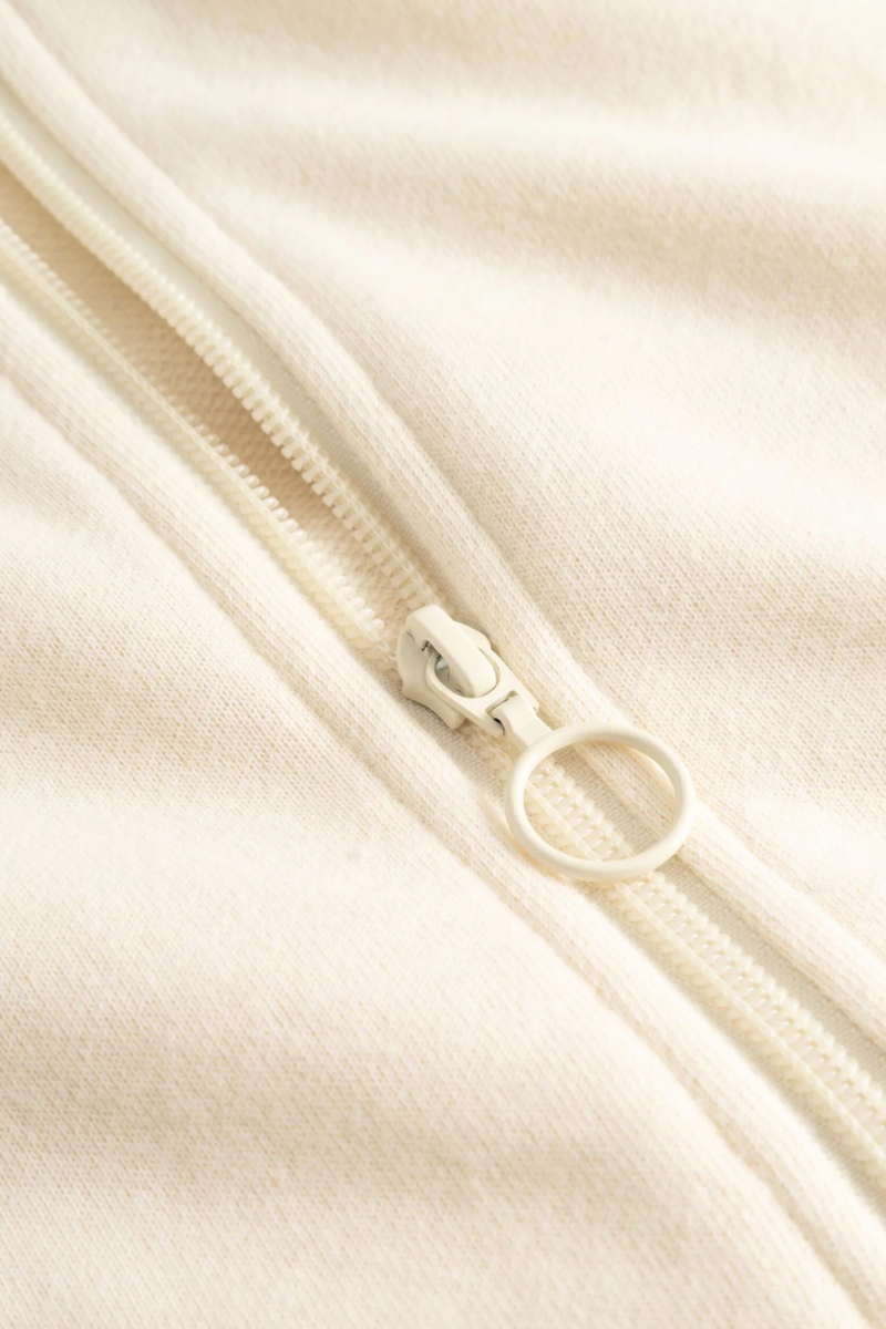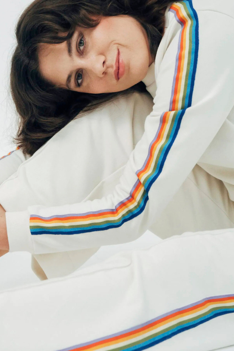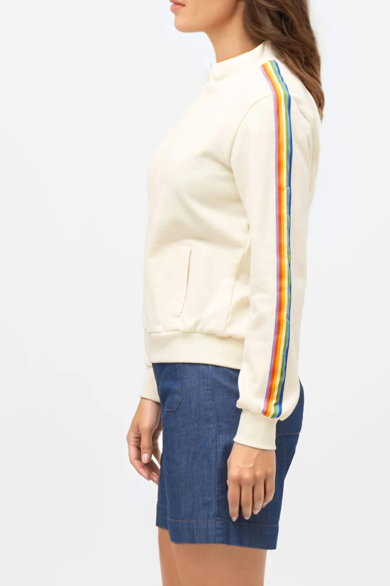 Die Jacke Rainbow Lover White von Mademoiselle YéYé ist nicht nur stylisch, sondern auch nachhaltig hergestellt. Das weiche Sweat-Material sorgt für Komfort und die normale Länge und Passform bieten eine perfekte Passgenauigkeit. Der durchgehende Reißverschluss und der Stehkragen aus Rippmaterial bieten zusätzlichen Schutz. Das Regenbogendetail auf den Ärmeln und die Bruststickerei machen diese Jacke zum Blickfang.