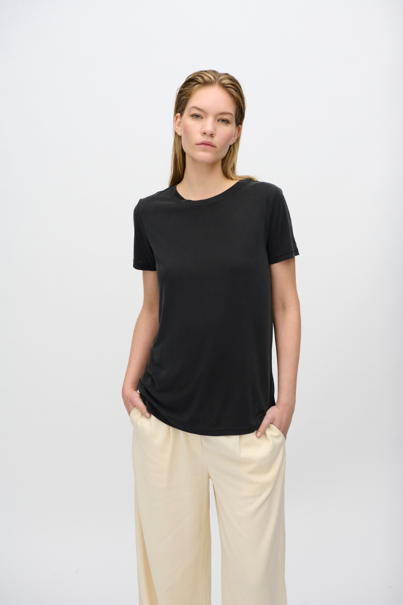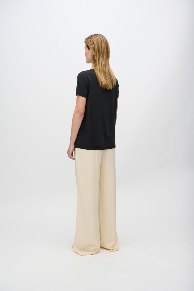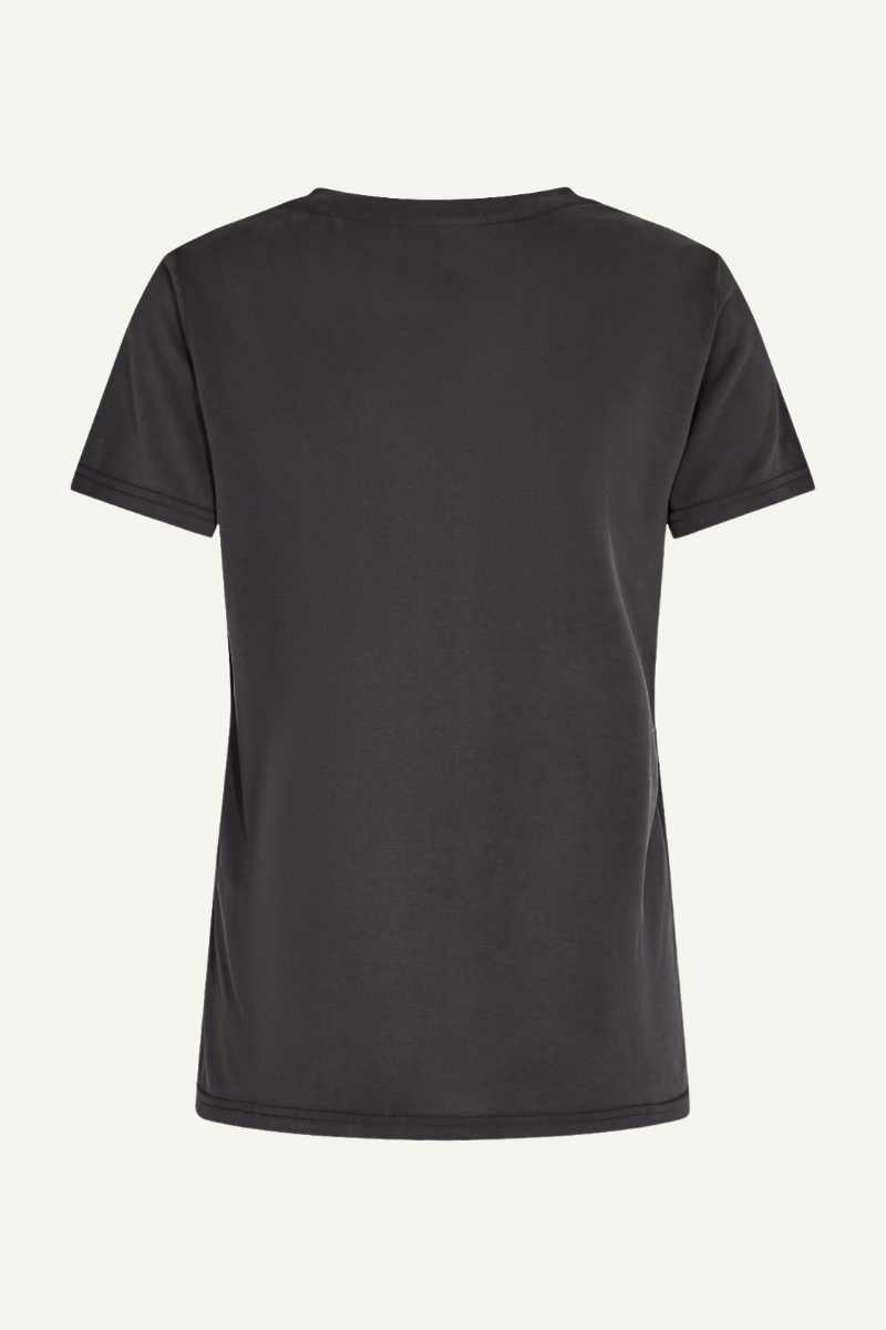 Rynah ist ein T-Shirt von Minimum Fashion mit kurzen Ärmeln aus 70 % Modal (TENCEL™) und 30 % recyceltem Polyester mit leicht verwaschener Optik. Das T-Shirt hat eine normale Passform und einen Rundhalsausschnitt. Das Model ist 180 cm groß und trägt Größe S.
