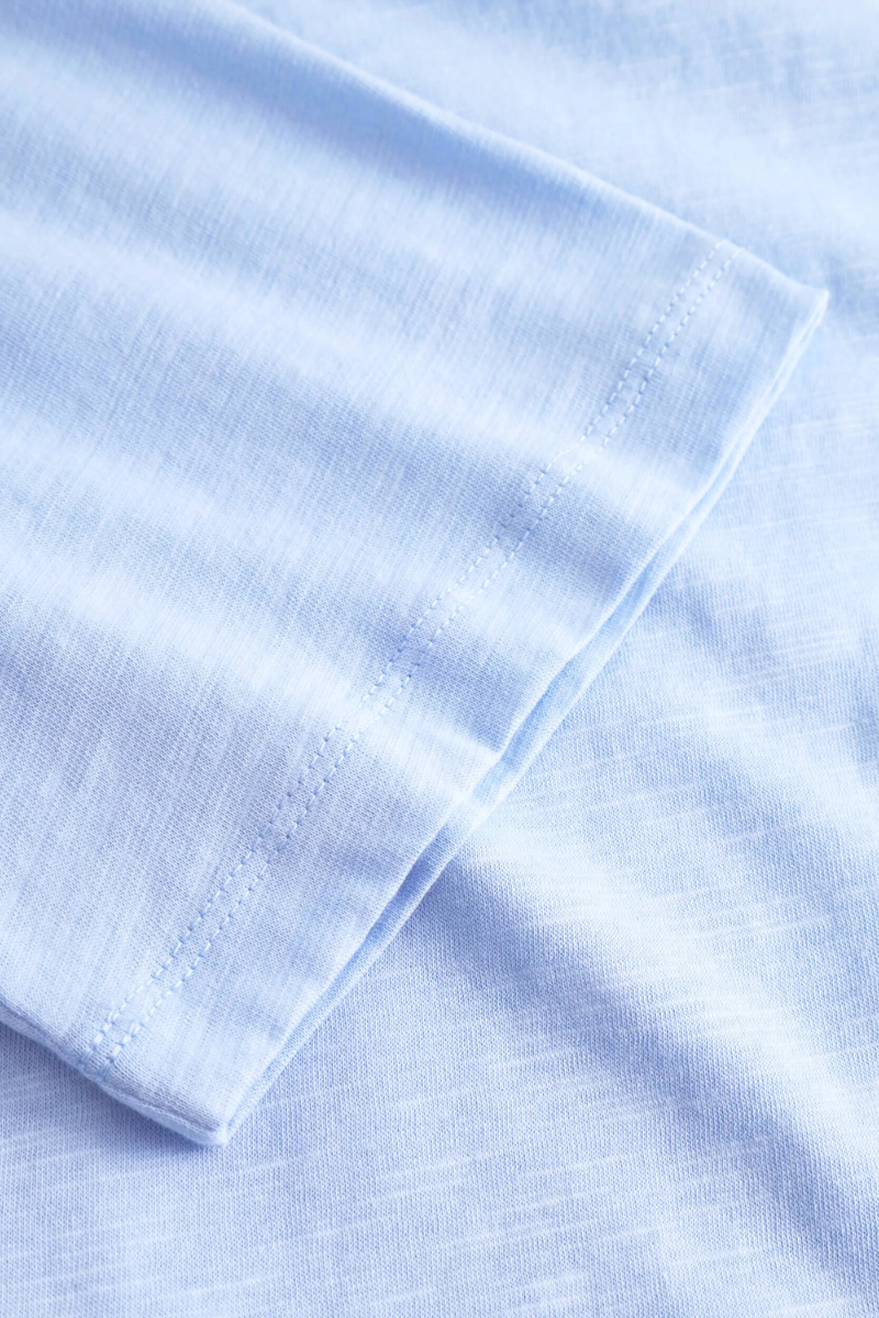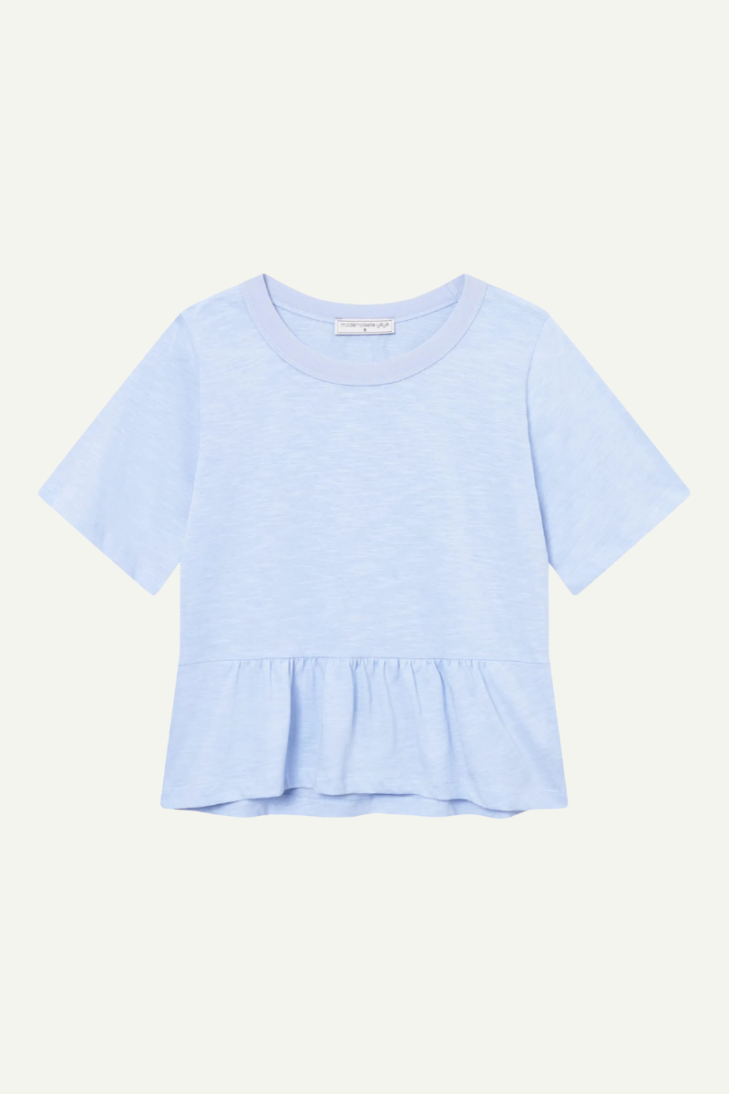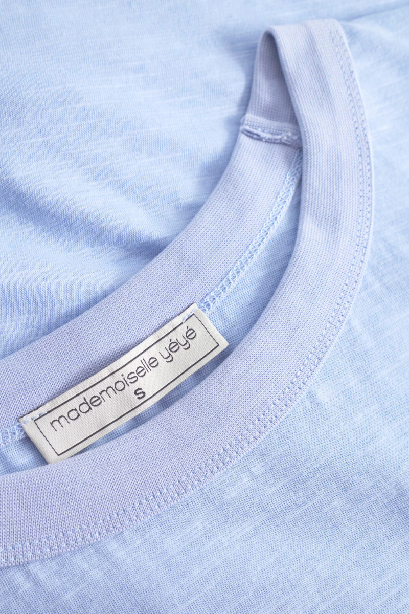 Dieses Shirt von Mademoiselle YéYé besteht aus weichem, leichtem Slub-Jersey und bietet eine gerade Passform mit leicht verkürzter Länge. Der runde Ausschnitt mit Rippbündchen und die kurzen Ärmel verleihen dem Shirt eine lässige Note, während das gekräuselte Volant am Saum eine feminine Note hinzufügt. Ein einfaches, cooles und feminines Shirt für heiße Sommertage.