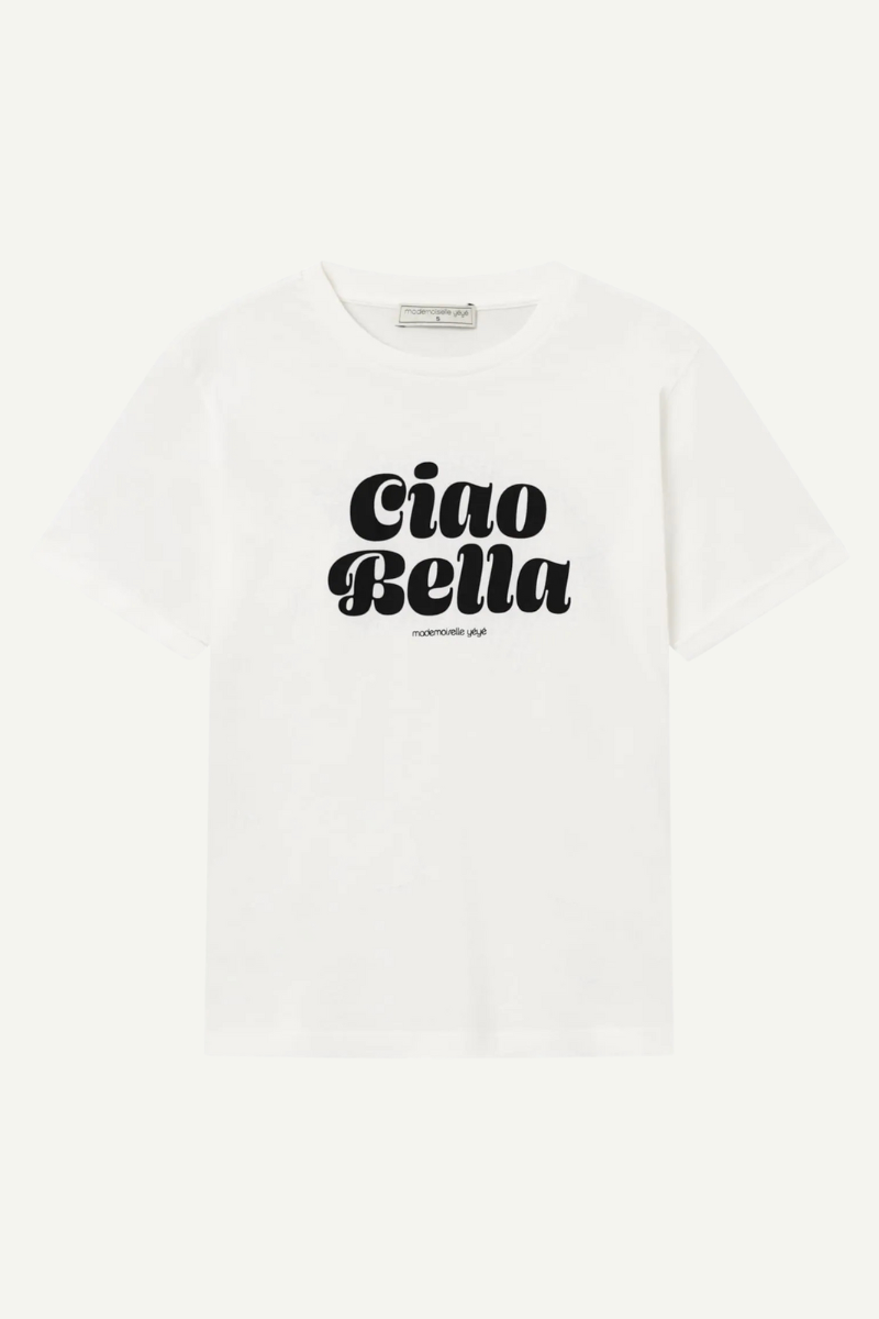 Unser beliebter Bestseller! Das weiße T-Shirt "Ciao Bella" von Mademoiselle YéYé ist ein Must-Have für den Sommer. Hergestellt aus weichem, nachhaltigem Baumwoll-Jersey und GOTS zertifiziert, bietet es eine lockere Passform, einen Rundhalsausschnitt mit Rippbündchen und kurze Ärmel mit Saumaufschlag. Keine Folie, nur hochwertiger Siebdruck.