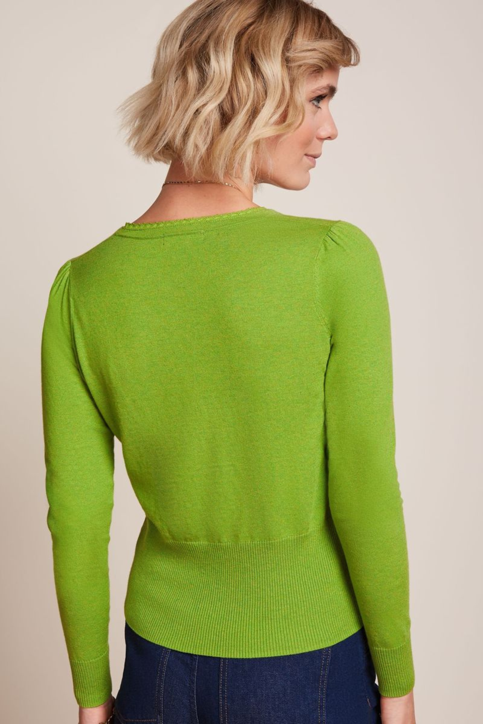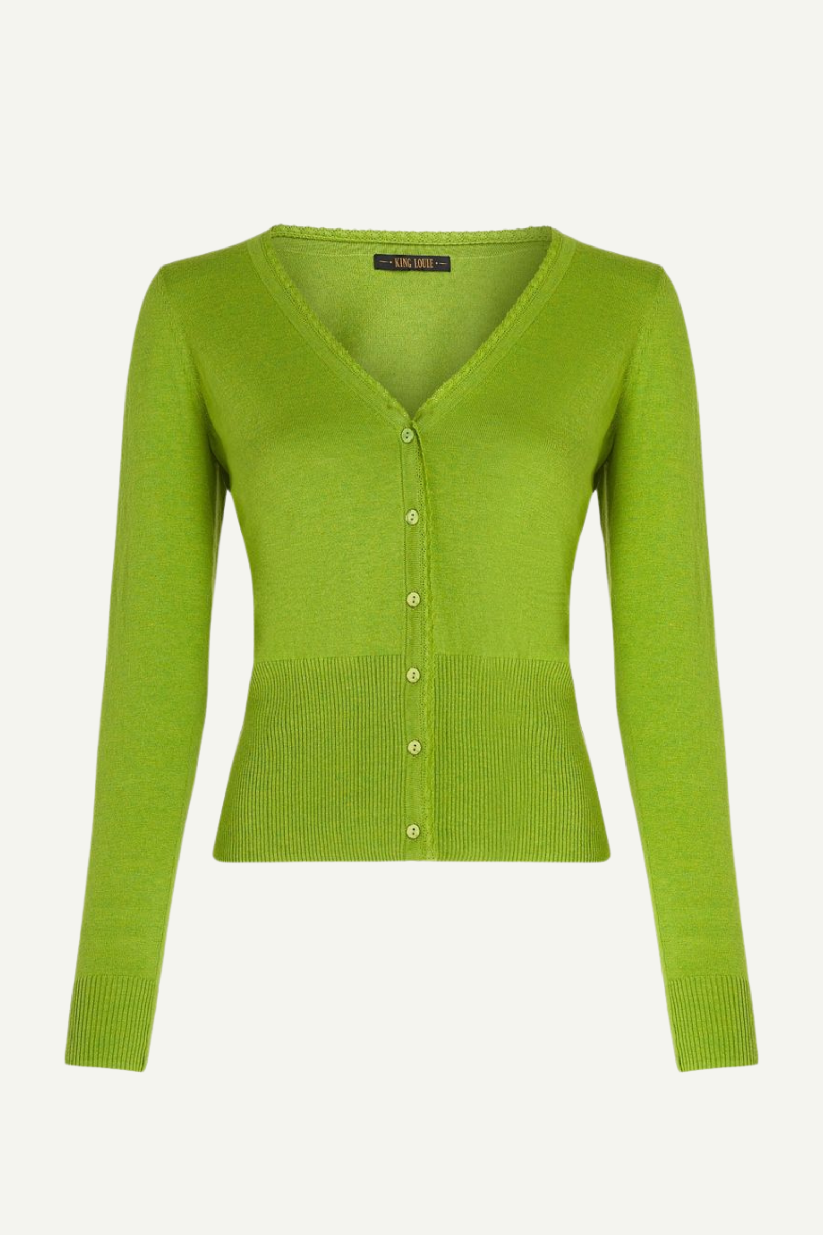 Taillierten Strickjacke von King Louie mit V-Ausschnitt. Die durchgehende Knopfleiste und die gerippten Abschlussbündchen machen die Strickjacke nicht nur schön, sondern auch praktisch. Gemacht aus Bio-Baumwolle und Seide, bietet sie dir höchsten Komfort.