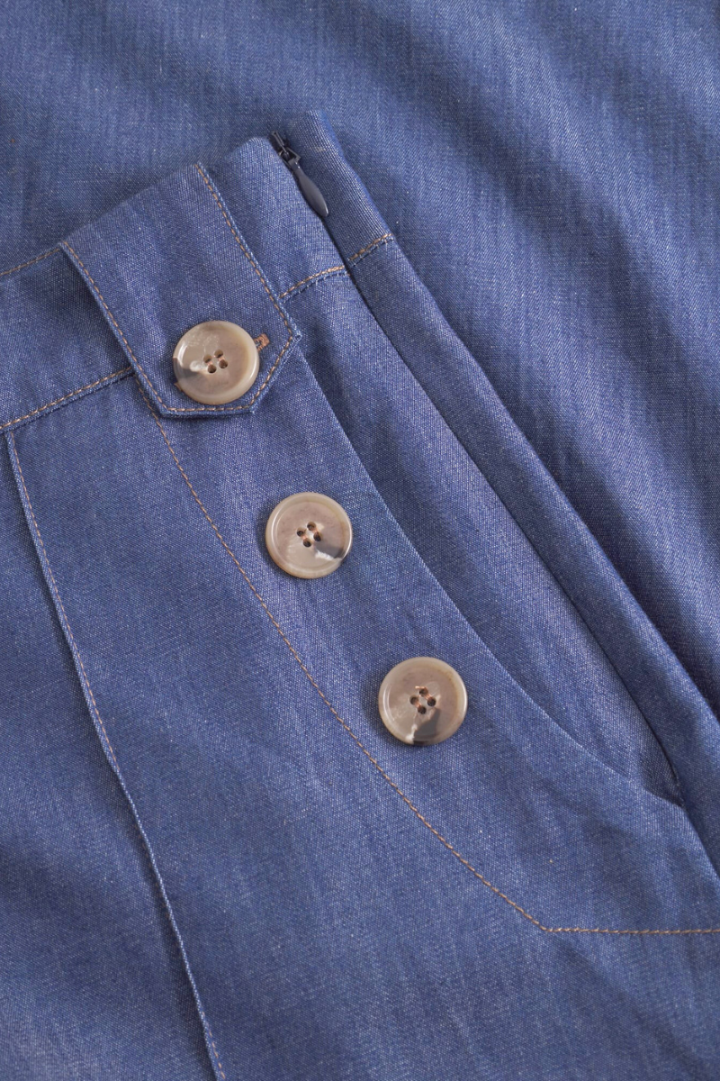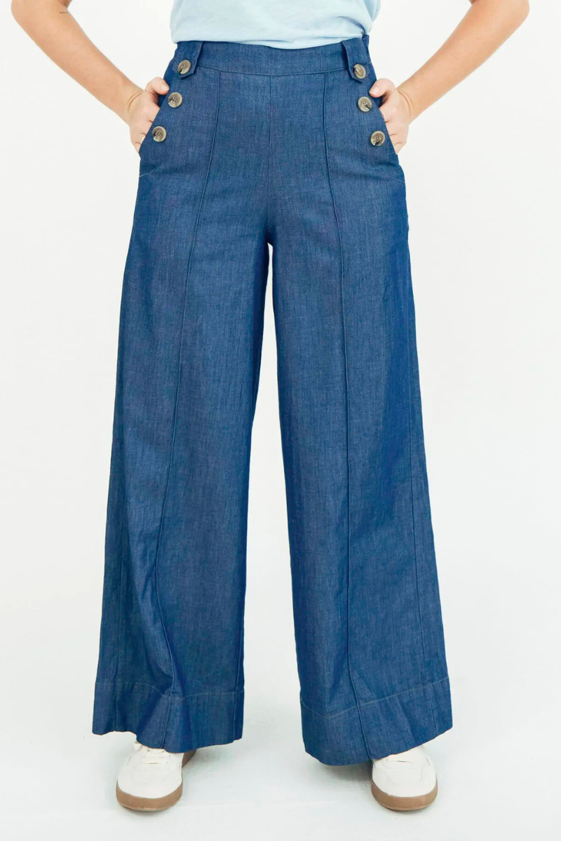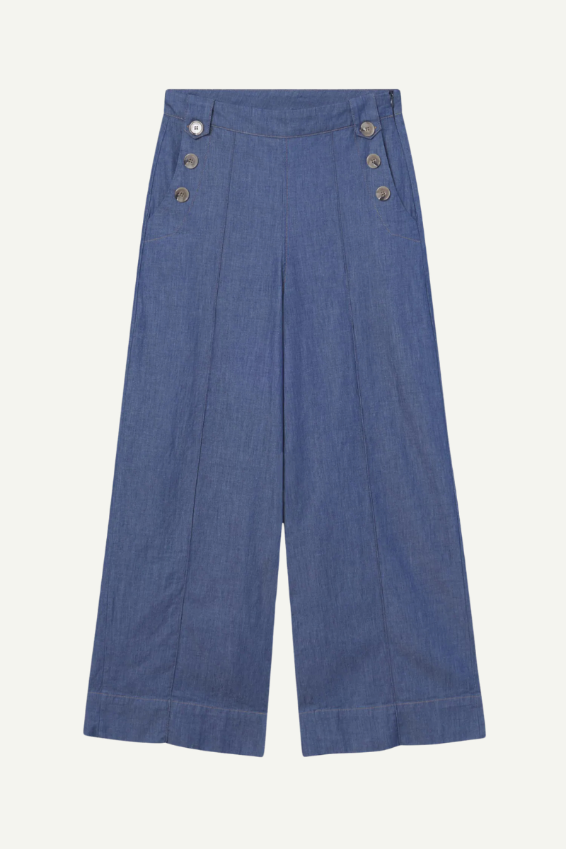 Die Hose von Mademoiselle YéYé ist der perfekte Begleiter für den Sommer. Die hochwertige Denim-Qualität mit etwas Stretch bietet optimalen Tragekomfort. Mit dem langen, ausgestellten Bein und dem nahtfeinen Reißverschluss in der Seitennaht setzt die Hose deine Beine gekonnt in Szene. Die seitlichen Eingriffstaschen und die Knopfelemente im Matrosenstil verleihen ihr zudem einen maritimen Look.