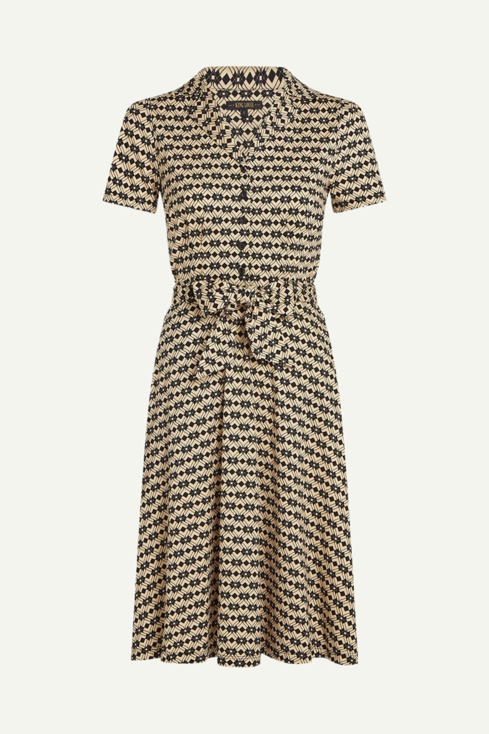 Verleihe deiner Garderobe mit dem Kleid Sheeva Fusili Black von King Louie einen Hauch von Eleganz. Die kurzen Ärmel und der Reverskragen sorgen für eine moderne Note, während der ausgestellte Schnitt und der Bindegürtel deine Figur betonen. Der Stretchkomfort und der Knopfverschluss bieten zusätzlichen Tragekomfort. Das grafische Muster auf weichem Jersey verleiht dem Kleid das gewisse Etwas.
