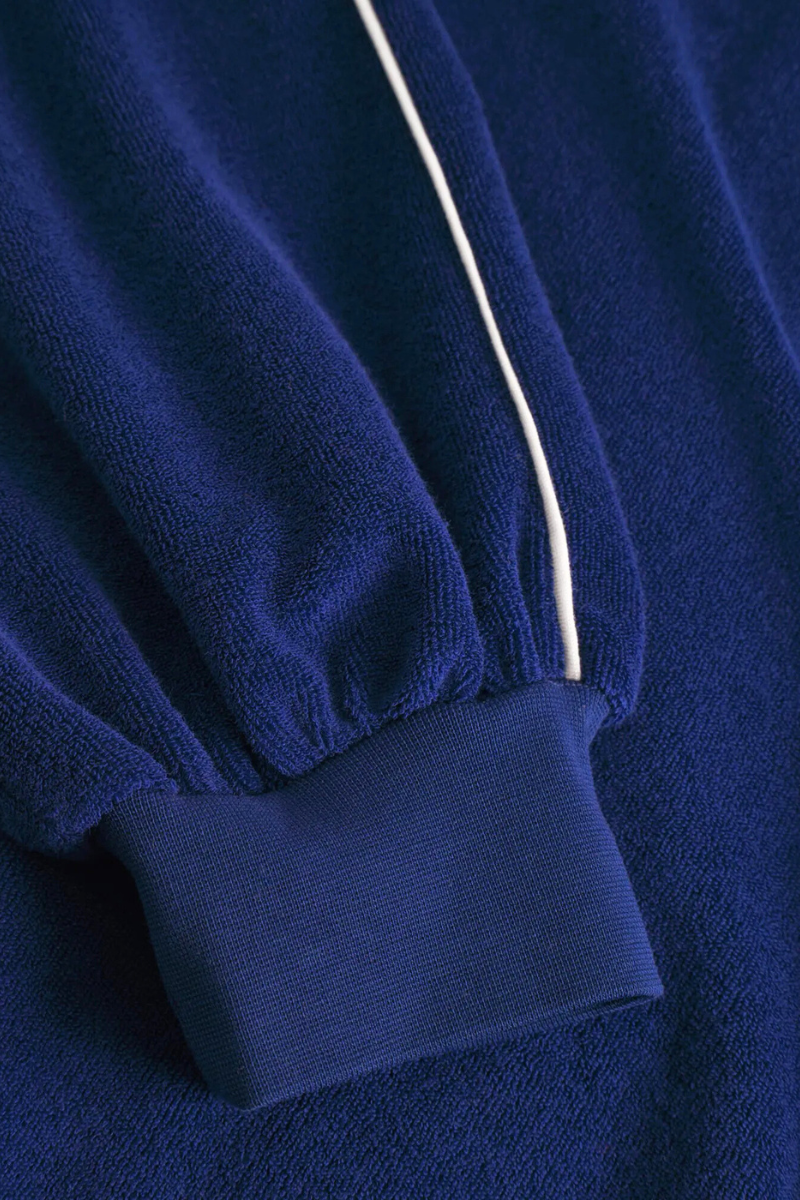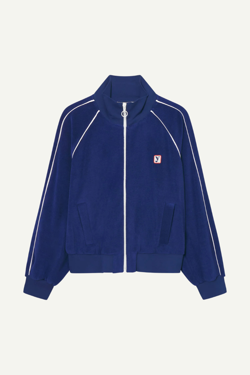 Bereit für Retro-Sports-Vibes? Die Jacke Retro Rally von Mademoiselle YéYé besteht aus leichtem Frottee-Material und bietet eine lässige Passform sowie eine verkürzte Länge. Der durchgehende Reißverschluss und die weiten Raglan Ärmel mit Rippbündchen sorgen für Tragekomfort. Der Stehkragen aus Rippmaterial, seitliche Eingriffstaschen und kontrastierende Paspelnähte verleihen der Jacke einen sportlichen Look. Mit Stickerei auf Brusthöhe.