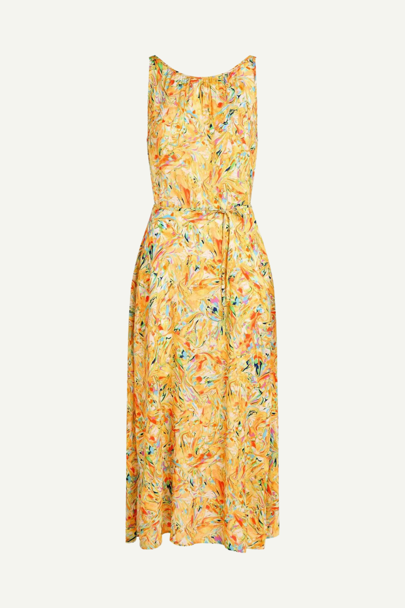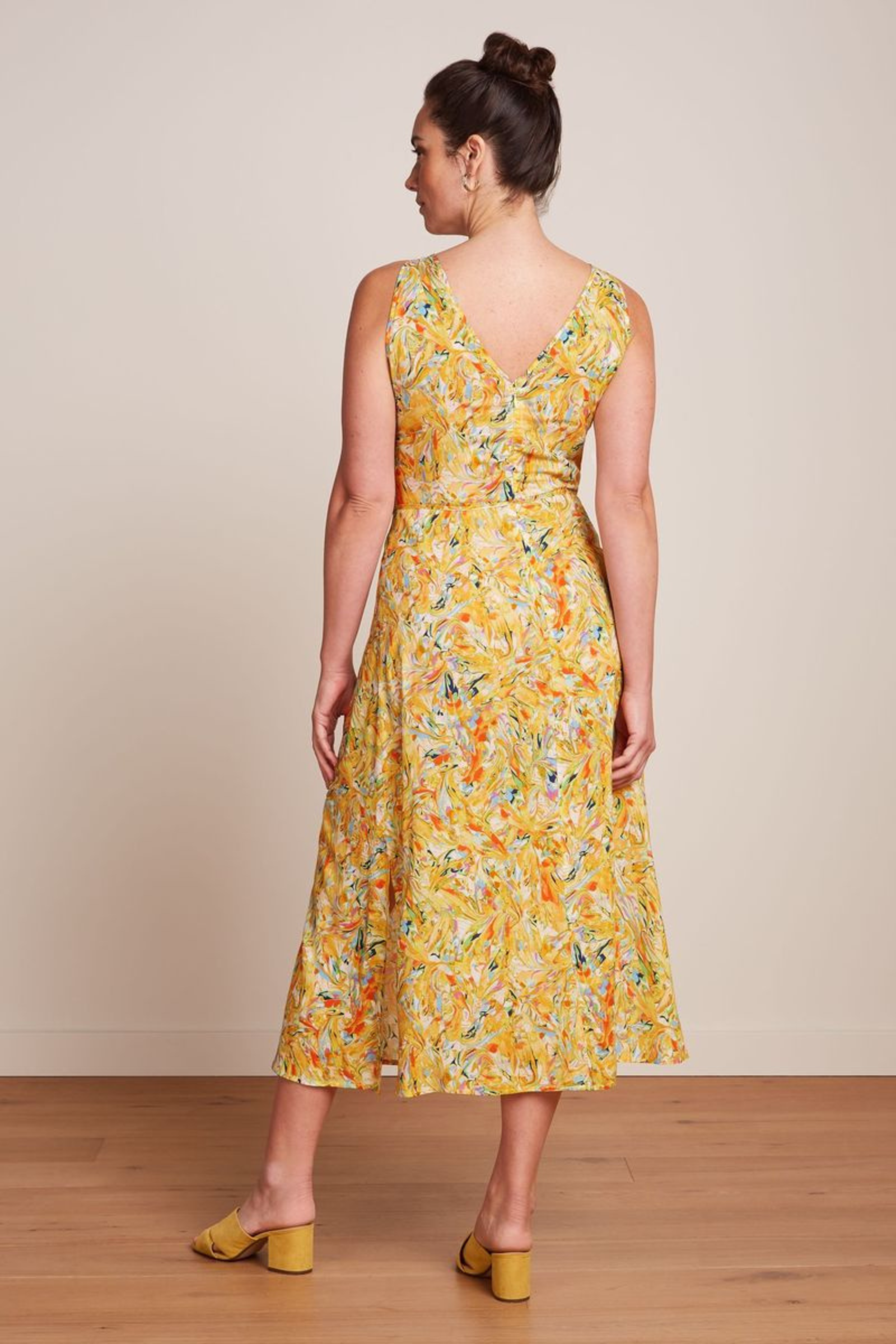Das Kleid von King Louie Creme-Goldgelb ist perfekt für sonnige Tage. Der tiefe Rückenausschnitt und die Falten um den Halsausschnitt verleihen eine feminine Note. Die Seitenschlitze und der ausgestellte Rock sorgen für Bequemlichkeit. Der Bindegürtel betont die Figur und der LENZING™ ECOVERO™ Viskose Stoff ist farbenfroh und nachhaltig.