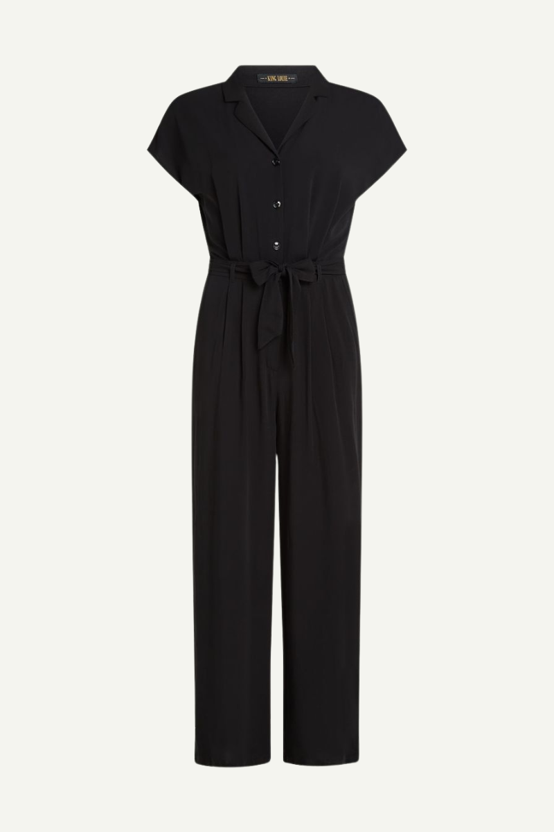 Dieser Jumpsuit von King Louie ist der perfekte Begleiter für jeden Anlass! Der fliessende Viskosestoff und der stoffeigene Bindegürtel sorgen für einen bequemen Sitz und eine schmeichelnde Silhouette. Der Jumpsuit verfügt über einen edlen Stehkragen und kurze Ärmel, die ihm eine moderne und elegante Optik verleihen.