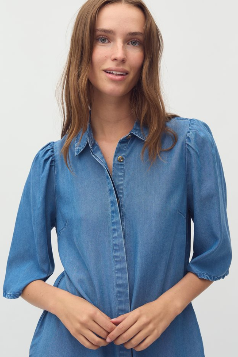 Das Kleid von Mbym vereint Stil und Komfort in einem. Hergestellt aus hochwertigen Materialien wie 66% TENCEL™ Lyocell und 33% LENZING™ ECOVERO™ Viskose, bietet es nicht nur einen verdeckten Knopfverschluss und kurze, weite Ärmel, sondern auch eine lockere Passform und einen trendigen Denim-Look. Perfekt für einen lässigen, aber dennoch stilvollen Look.