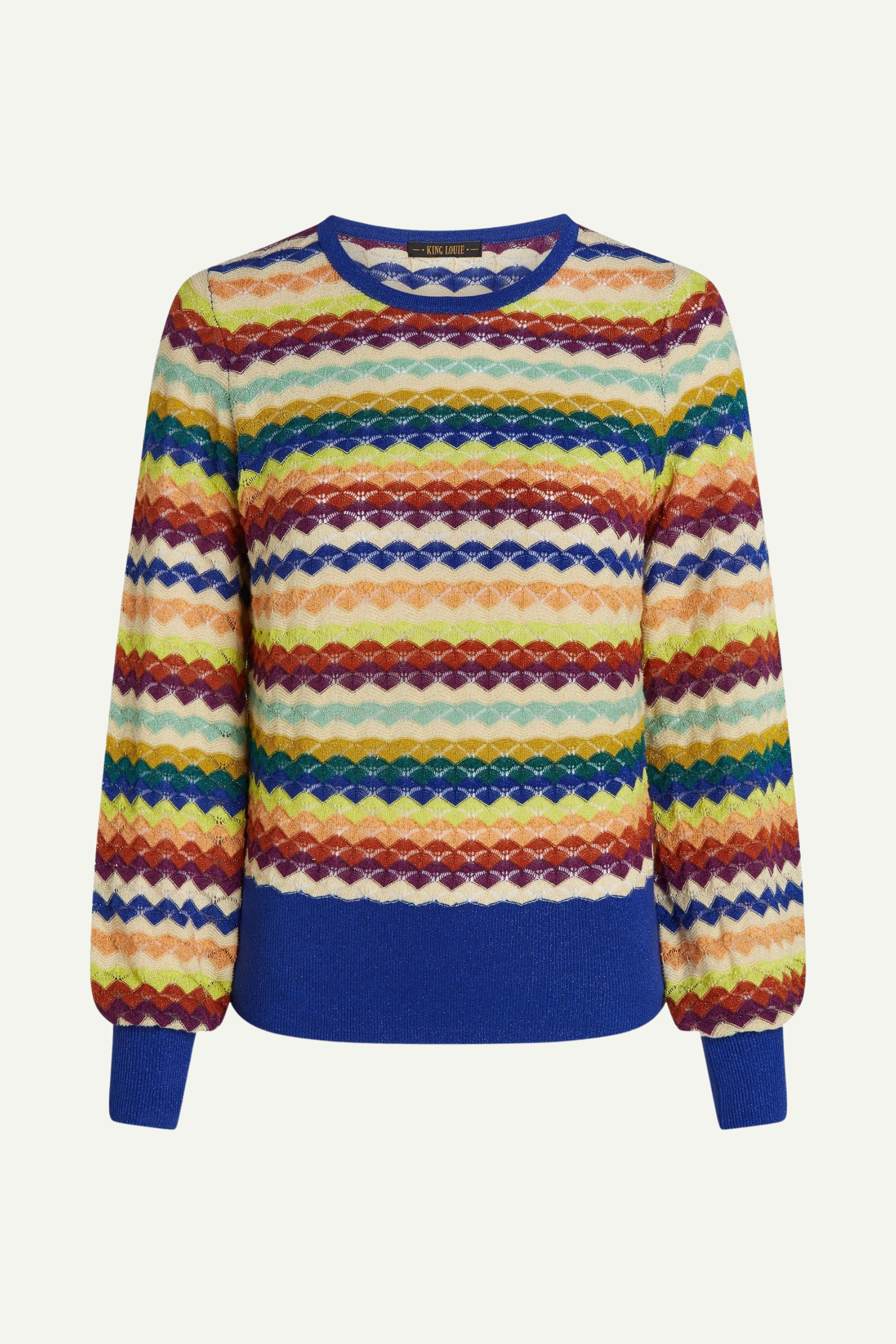 Die weiten Glockenärmel und das Zick-Zack-Muster mit Glitzer verleihen einen trendigen Look. Der Pullover von King Louie bietet dank des Rundhalsausschnitts und des Strickmaterials ein angenehmes Tragegefühl.