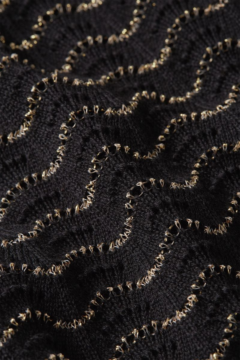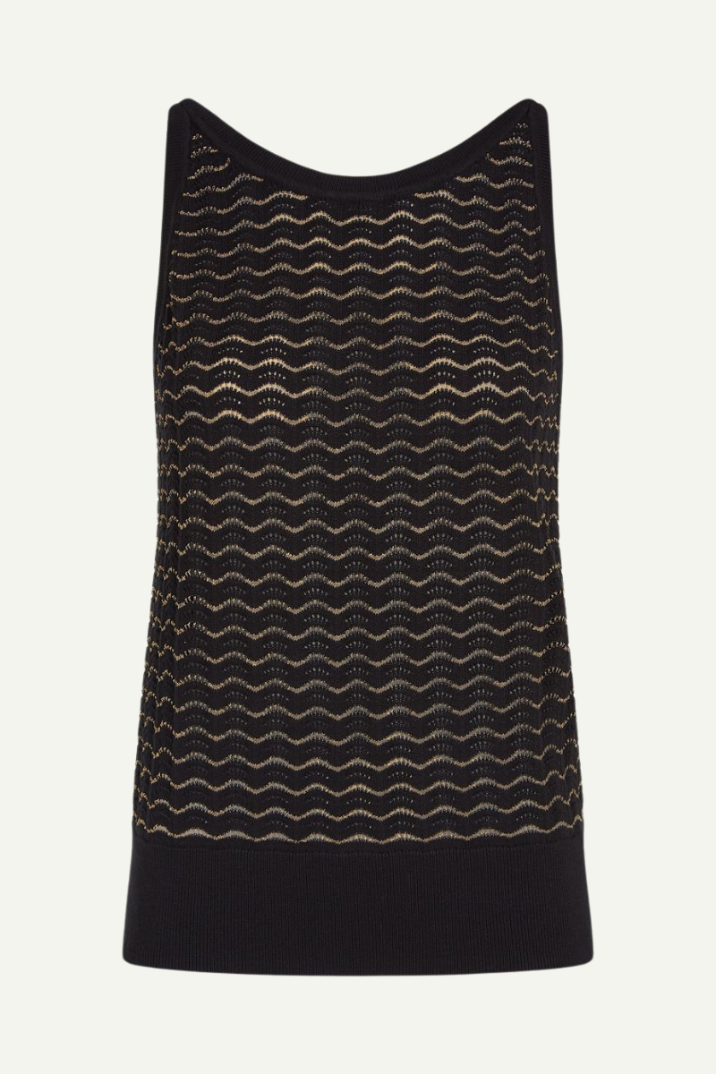 Lass dich von dem Tief ausgeschnittenen Rücken und den breiten Schulterbändern des Tops Hazel Onde Black von King Louie begeistern. Der Ajourstrick mit Glitzer verleiht ihm eine besondere Note, während der Rundhalsausschnitt und das Stretchmaterial für höchsten Komfort sorgen. Perfekt für einen unkomplizierten Look.