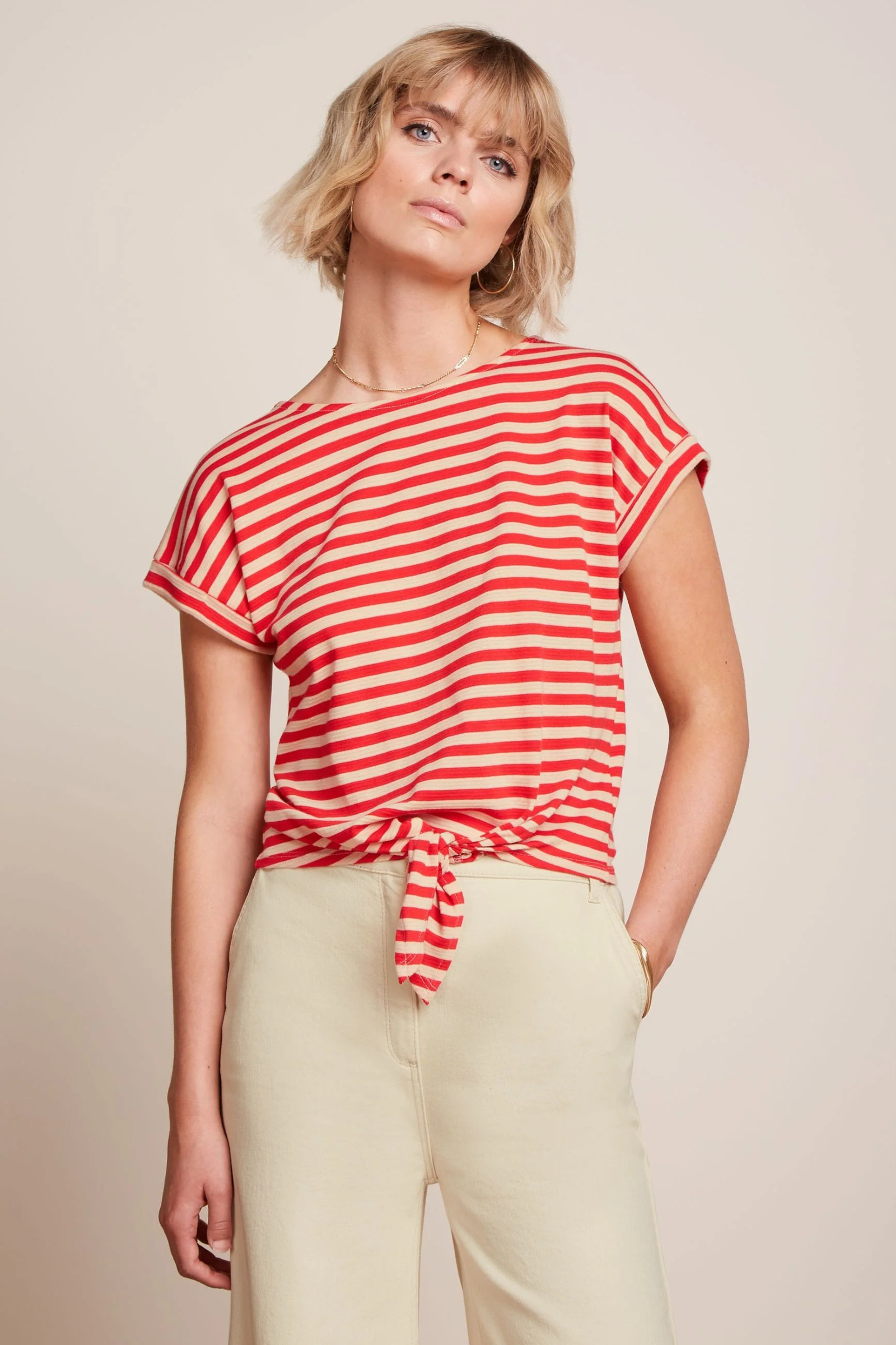 Das Top von King Louie bietet einen komfortablen Stretch mit lockerer Passform. Mit dem Rundhalsausschnitt und den kurzen Ärmeln ist es ideal für warme Tage. Der gestreifte Print und das Knotendetail verleihen zusätzlich eine modische Note