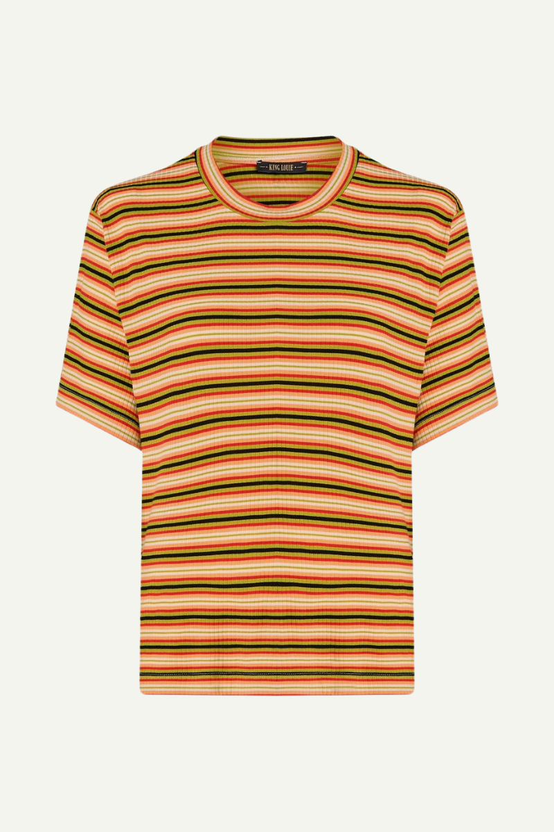 Dieses T-Shirt von King Louie ist der perfekte Begleiter für den Sommer. Dank des lockeren Schnitts und der Ripp-Struktur lässt es sich ideal mit Jeans, Röcken oder Shorts kombinieren. Der angenehme Stoff sorgt für ein komfortables Tragegefühl, während der Seaside-Streifen-Look für einen frischen und lässigen Look sorgt.