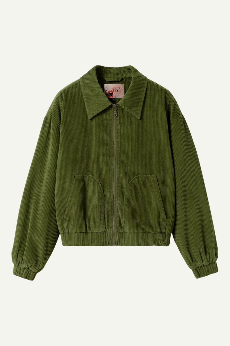 Diese nachhaltig produzierte Jacke von Mademoiselle YéYé in strahlendem Grün vereint Retro-Charme mit modernem Stil. Der große Umlegekragen und die aufgesetzten, abgerundeten Taschen setzen markante Akzente, während der weiche, gefütterte Cordstoff für angenehmen Tragekomfort sorgt. Breite Ärmel mit Rippbündchen an Ärmeln und Saum verleihen eine lässige Passform und coole Optik. Der praktische Reißverschluss vorne macht das An- und Ausziehen kinderleicht. Ideal für alle, die nachhaltige Mode mit einzigartigem Design schätzen.