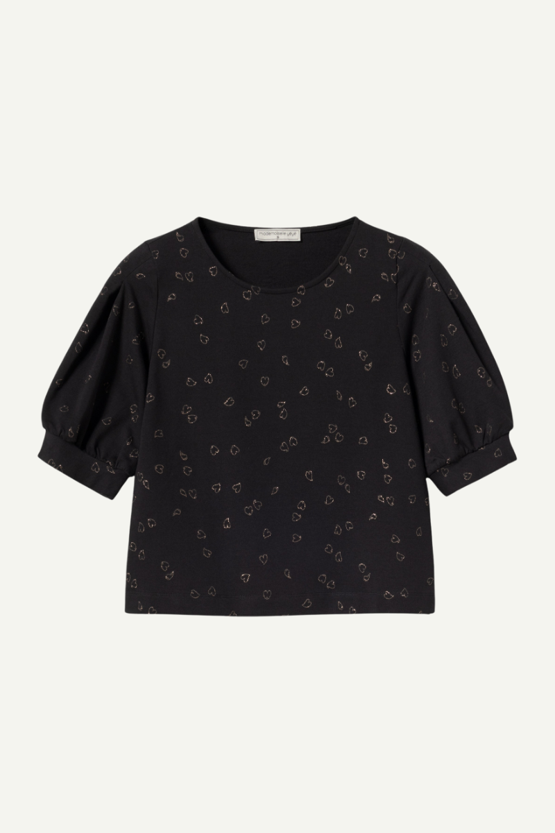 Dieses Top von Mademoiselle YéYé verbindet den Komfort eines Sweatshirts mit einem eleganten Party-Look. Der dezente Herzblatt-Print verleiht jedem Outfit eine charmante Note, inspiriert von sanft wehenden Blättern. Hergestellt aus nachhaltigem, zertifizierten Jersey, bietet es eine weiche, kompakte Qualität und eine gerade Passform, die für angenehmen Sitz sorgt. Der Rundhalsausschnitt und die kurzen Ärmel mit Faltendetail runden das Design stilvoll ab. Ideal für entspannte Tage und besondere Abende.