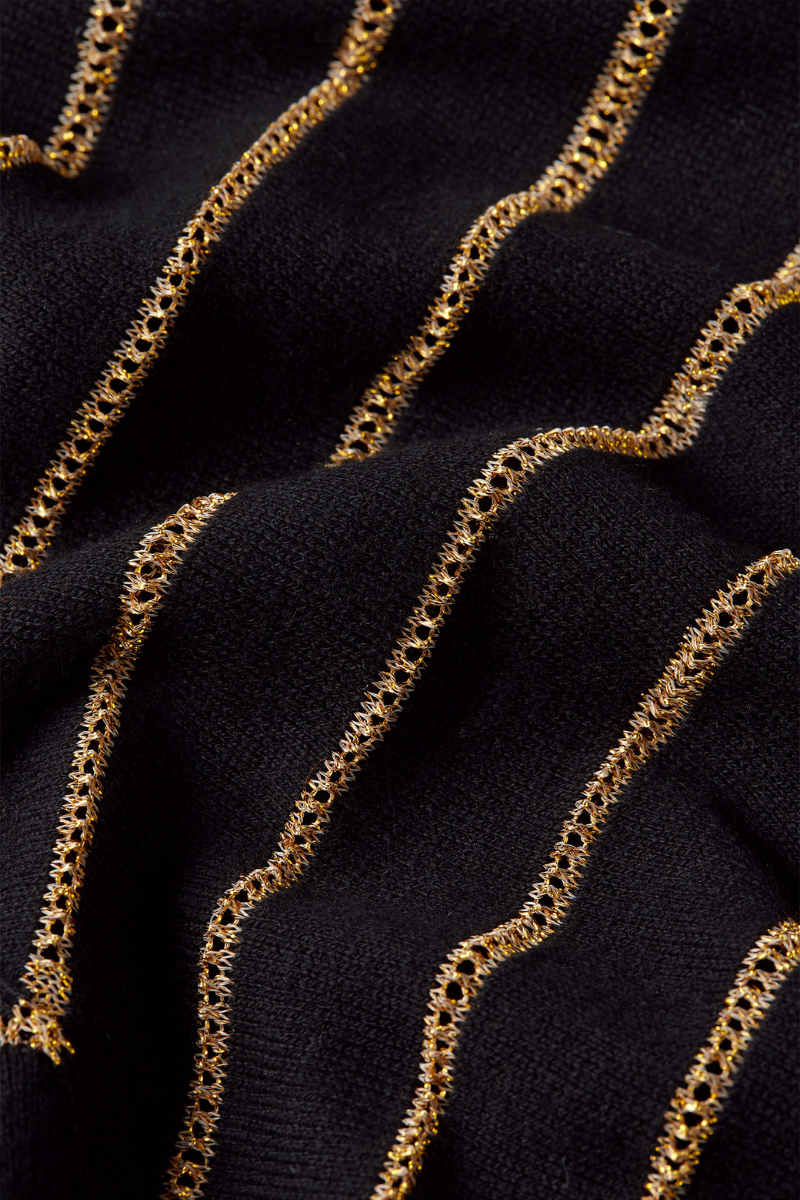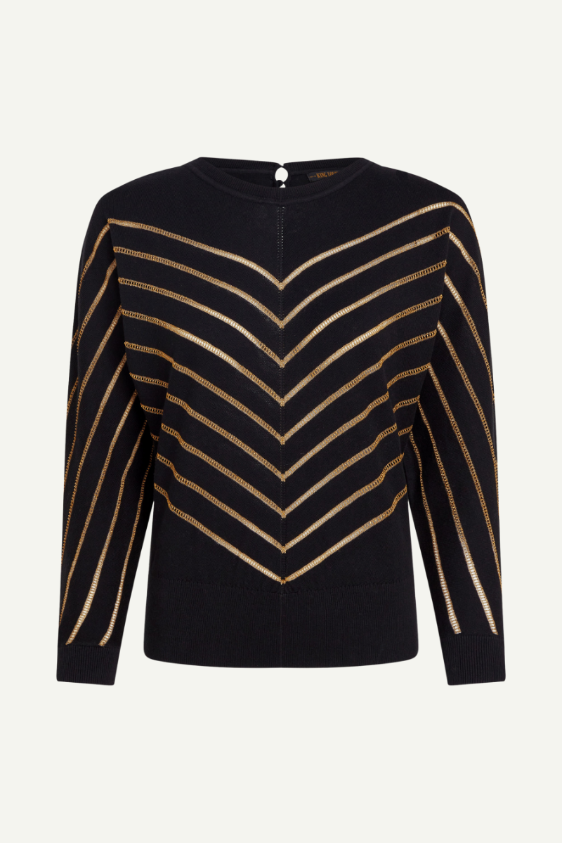 Das Top Joy Plume Black vereint zeitlose Eleganz mit außergewöhnlichem Tragekomfort. Der locker sitzende Schnitt mit Fledermausärmeln sorgt für Bewegungsfreiheit, während der feine Materialmix aus Baumwolle, Kaschmir und goldenem Lurex für ein luxuriöses, sanftes Hautgefühl und dezente Highlights steht. Der Rundhalsausschnitt und der elegante Schlaufenverschluss am Rücken mit Keyhole-Knopf schaffen eine feminine Note. Dieses gestreifte Stricktop lässt sich vielseitig kombinieren und bringt Stil in jeden Look.