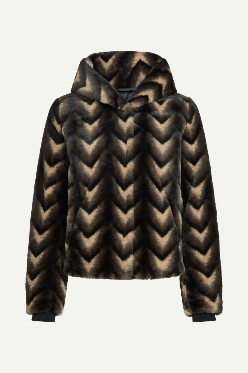 Diese kurze Jacke mit Kapuze und rundem Ausschnitt vereint Stil und Funktionalität perfekt. Die langen Ärmel mit Bündchen und die schrägen Taschen bieten praktischen Komfort, während der Knopfverschluss für eine sichere Passform sorgt. Das weiche, gefütterte Kunstfell hält angenehm warm, und das moderne Zickzackmuster setzt modische Akzente. Ideal, um an kühlen Tagen trendbewusst und gleichzeitig gemütlich unterwegs zu sein.