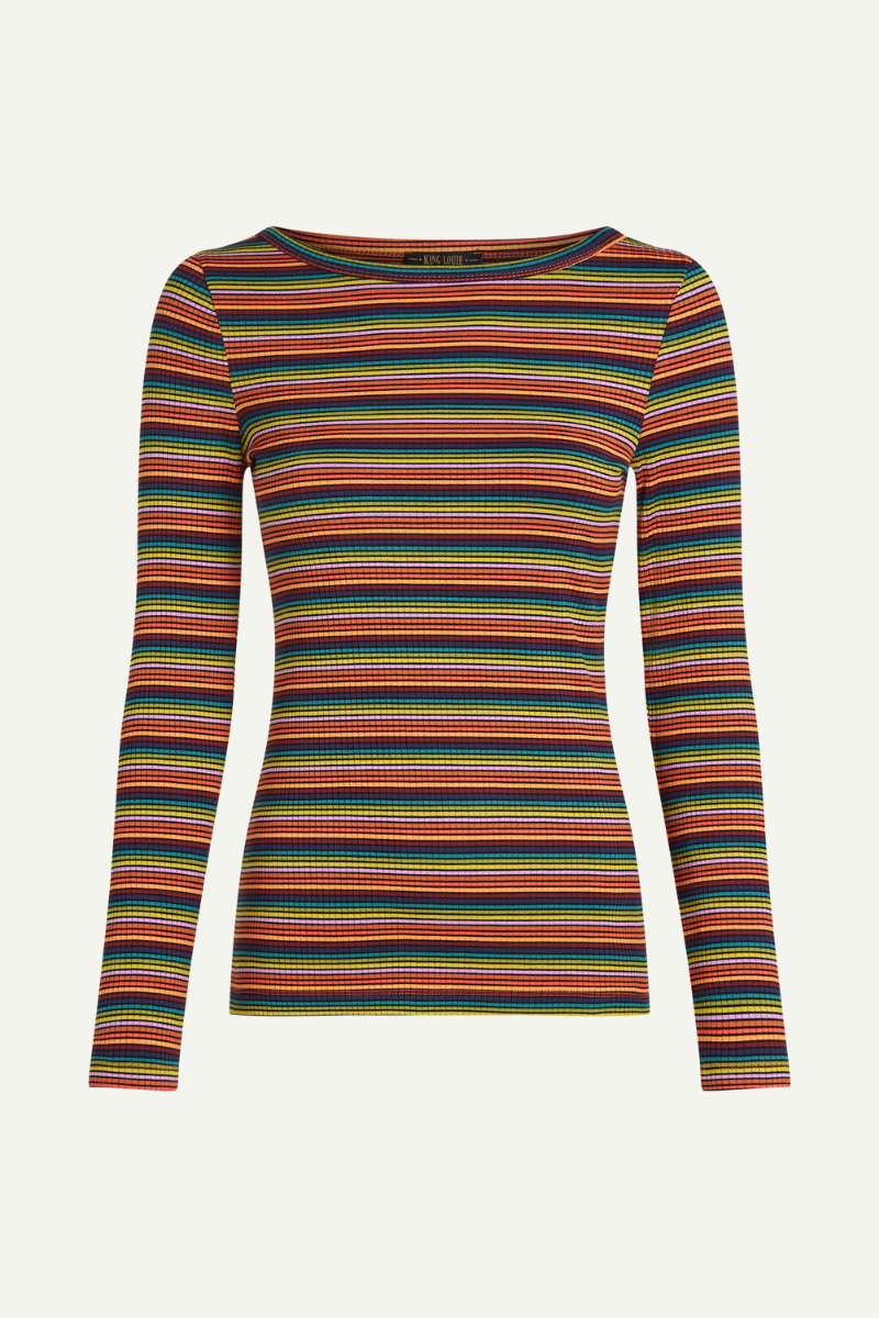 Das Longsleeve T-Shirt Lili Lumi Stripe von King Louie bringt mit seinem lebhaften Streifenmuster frischen Schwung in deine Garderobe. Aus weichem, elastischem Viskose-Jersey gefertigt, bietet es angenehmen Tragekomfort und eine schmeichelhafte Passform dank des Rundhalsausschnitts und der langen Ärmel. Perfekt, um deinem Alltagslook eine fröhliche Note zu verleihen.
