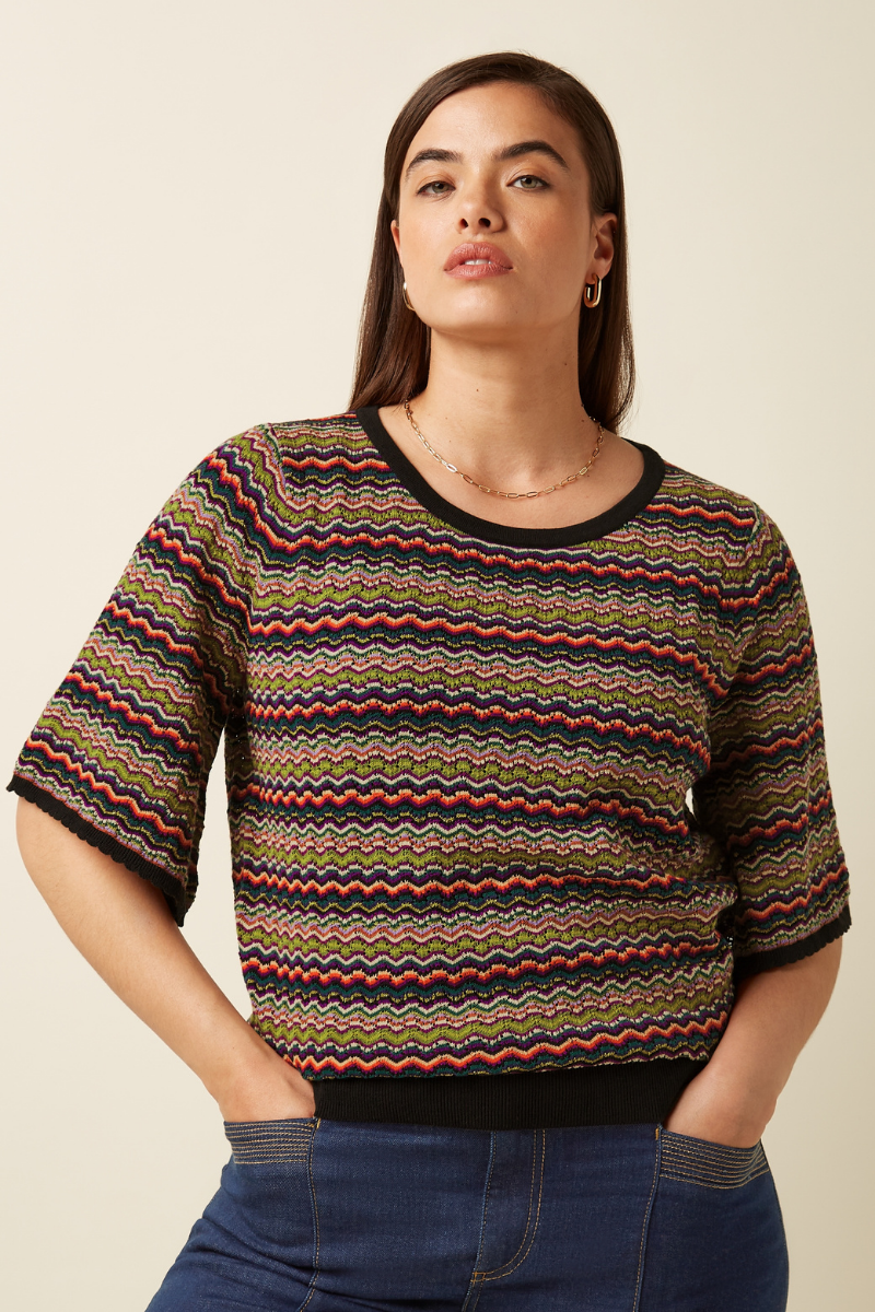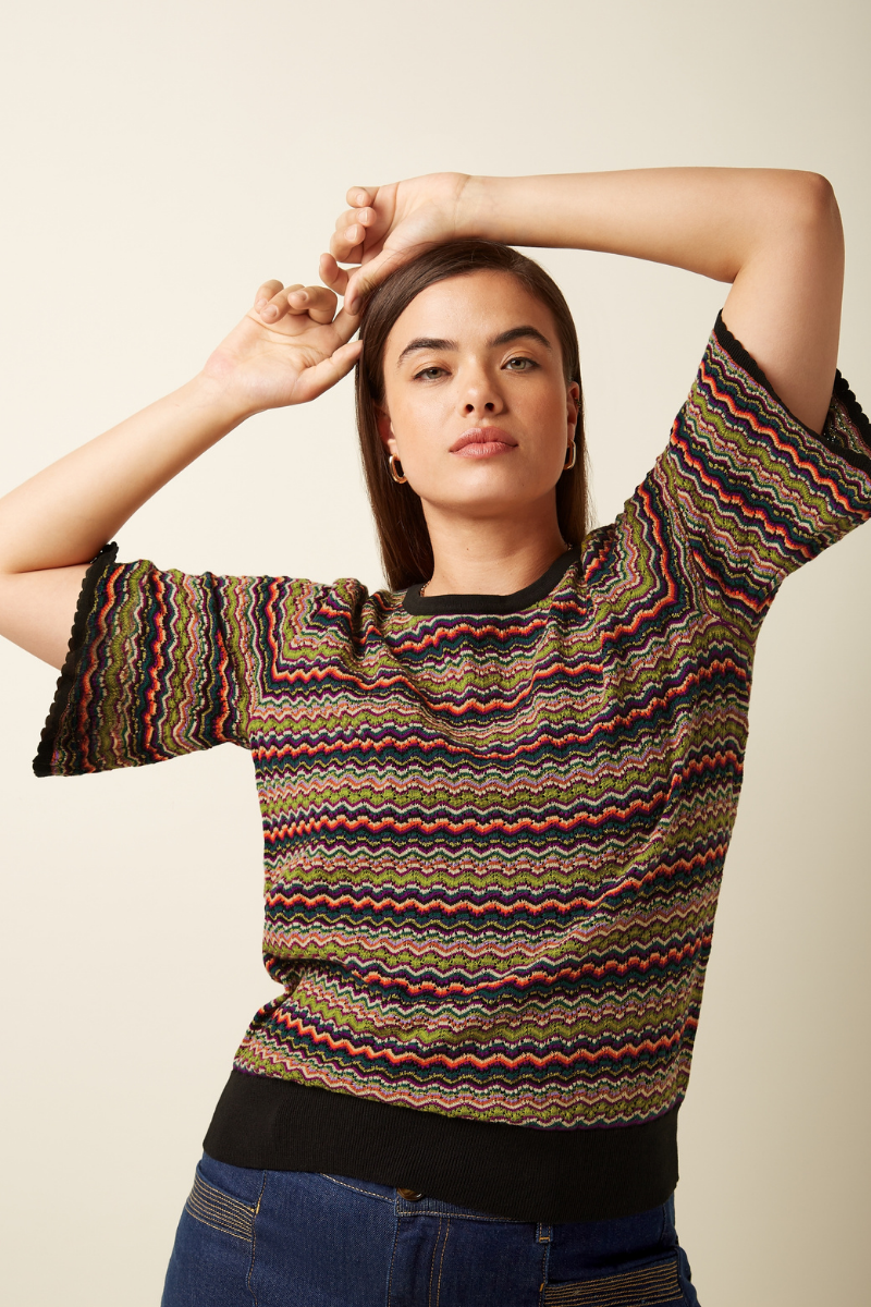 Das Maree Top Meisel Multi Colorvon KING LOUIE verbindet Komfort und Stil dank seines weichen Baumwoll-Lurexstricks mit Stretchanteil. Das elegante Zickzackmuster zieht bewundernde Blicke auf sich, während der klassische Rundhalsausschnitt und die halblangen Ärmel für eine zeitlose Silhouette sorgen. Ideal für alle, die modische Raffinesse mit angenehmem Tragegefühl schätzen.