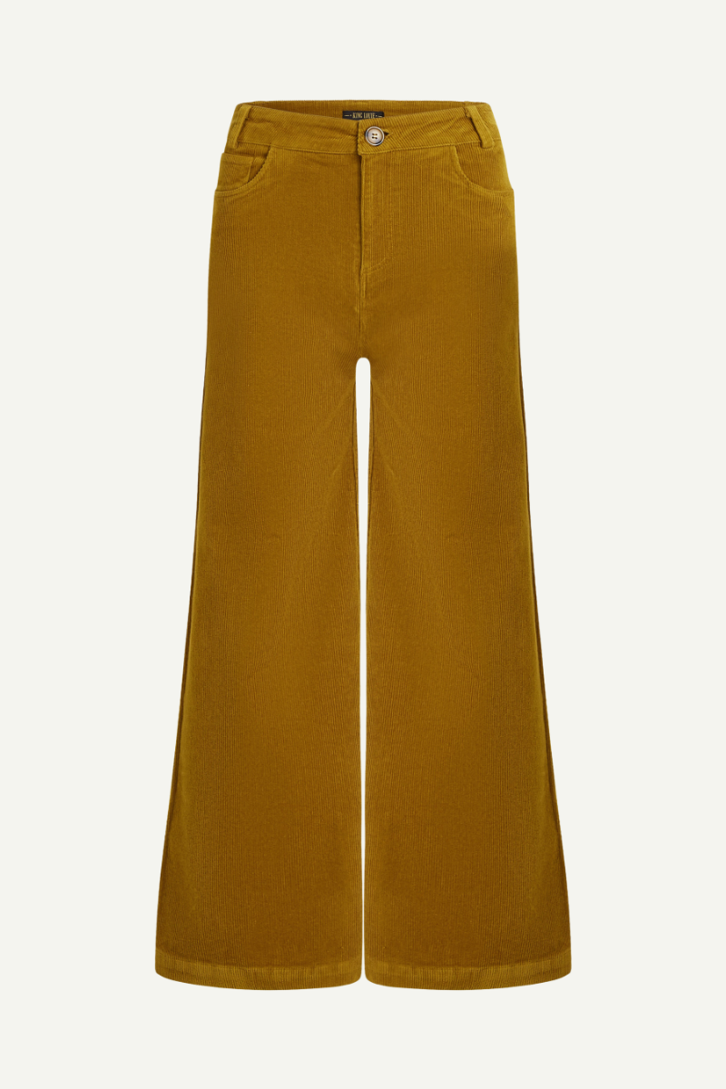 Die Hose "Peppa Petit Corduroy" in Golden Brown von King Louie überzeugt mit hohem Bund und Gürtel-Schlaufen für eine perfekte Passform. Die schrägen Taschen und der schmale Schnitt betonen Ihre Silhouette, während die weiten Beine für Komfort sorgen. Aus hochwertigem Baumwoll-Cord mit angenehmem Stretch gefertigt, bieten sie sowohl Stil als auch Bewegungsfreiheit.