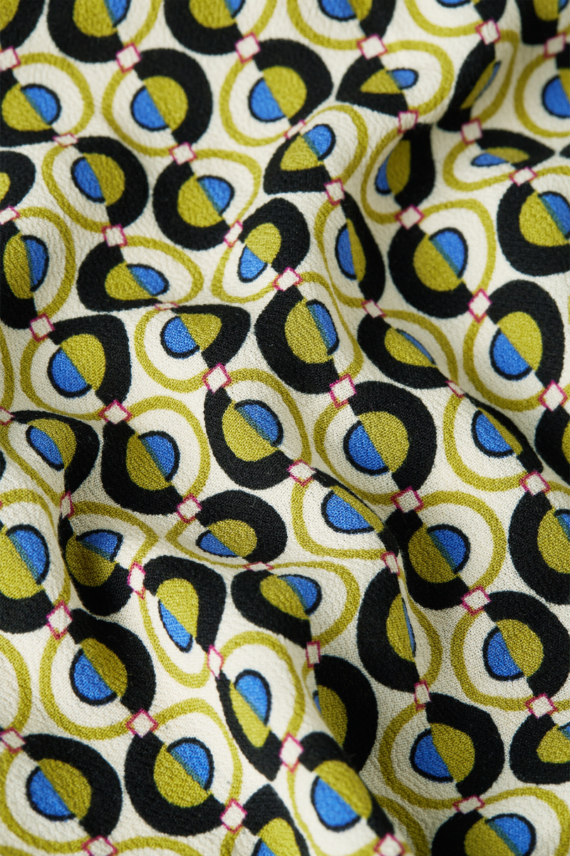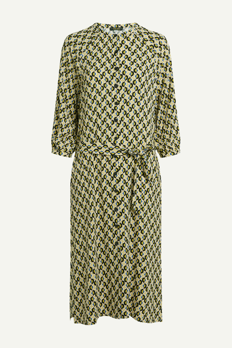 Die geometrische Musterung verleiht dem cremefarbenen Kleid einen modernen Touch. Die Knopfleiste ermöglicht einfaches An- und Ausziehen. Ohne Stretch-Anteil besticht das Kleid durch seine strukturierte Qualität und zeitlose Ästhetik.