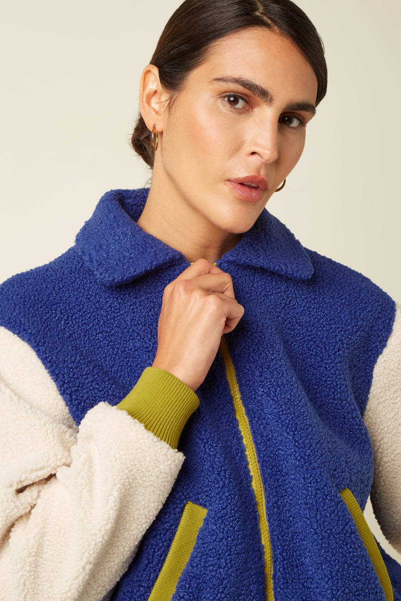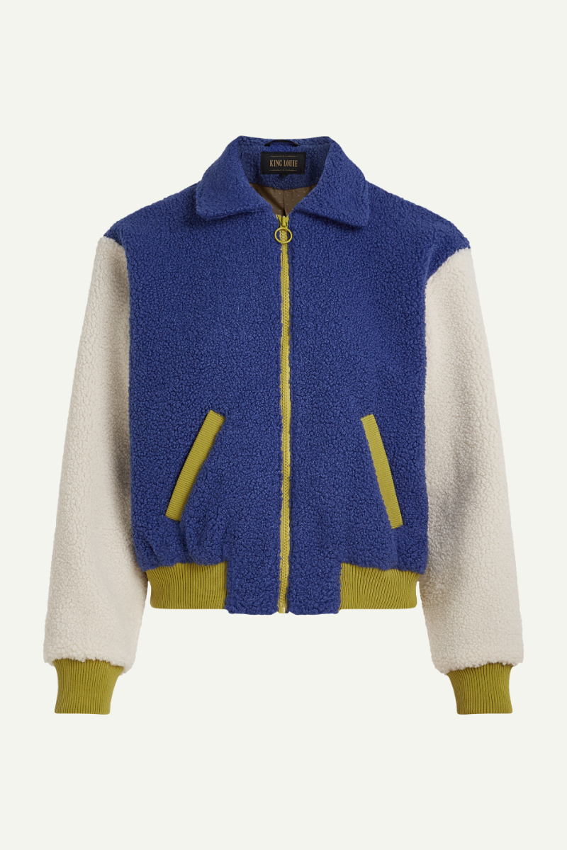 Die Jacke Fay Teddy Bluing von KING LOUIE ist eine zweifarbige Baseball-Jacke mit charakteristischer Teddy-Textur.