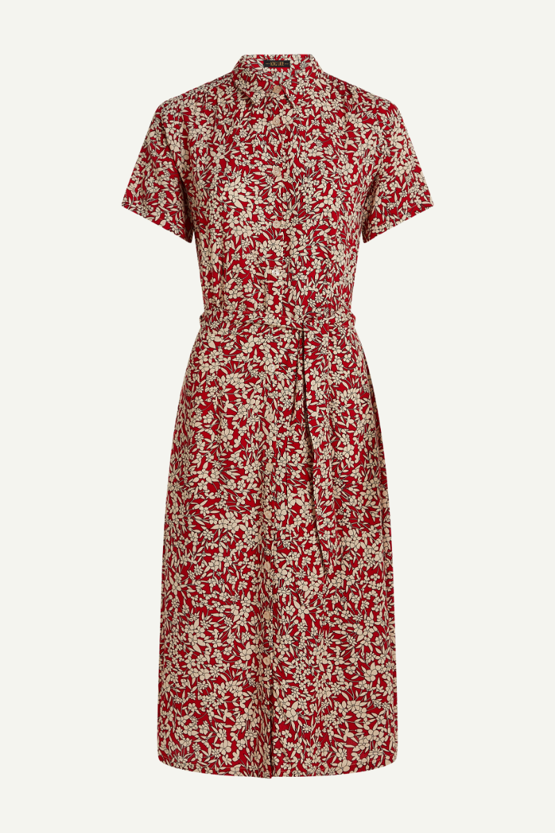 Elegantes Midikleid von King Louie mit klassischem Blusencharakter und durchgehender Knopfleiste. Das Modell besticht durch seinen regulären Schnitt mit leicht ausgestelltem Saum und praktischen Seitentaschen. Kurzärmel und Bindegürtel definieren die Taille subtil. Das gewebte Baumwollmaterial ohne Stretch bietet angenehmen Tragekomfort und Formbeständigkeit. Das florale Muster in Chili Red auf Olivgrund verleiht dem Kleid zeitlose Eleganz für vielseitige Anlässe.